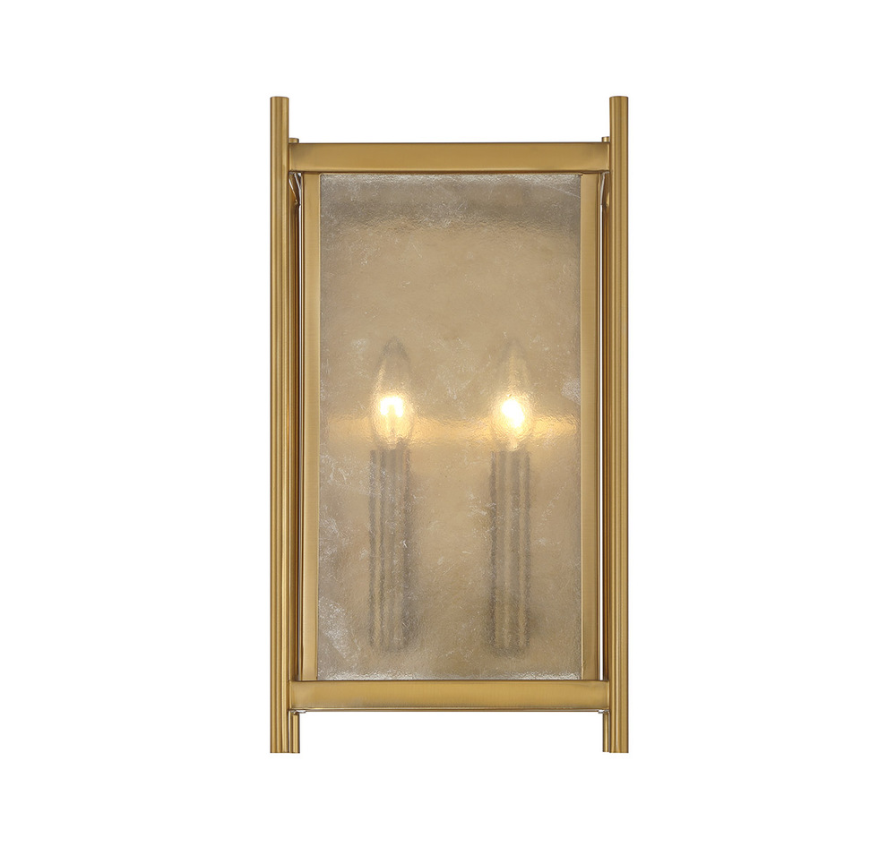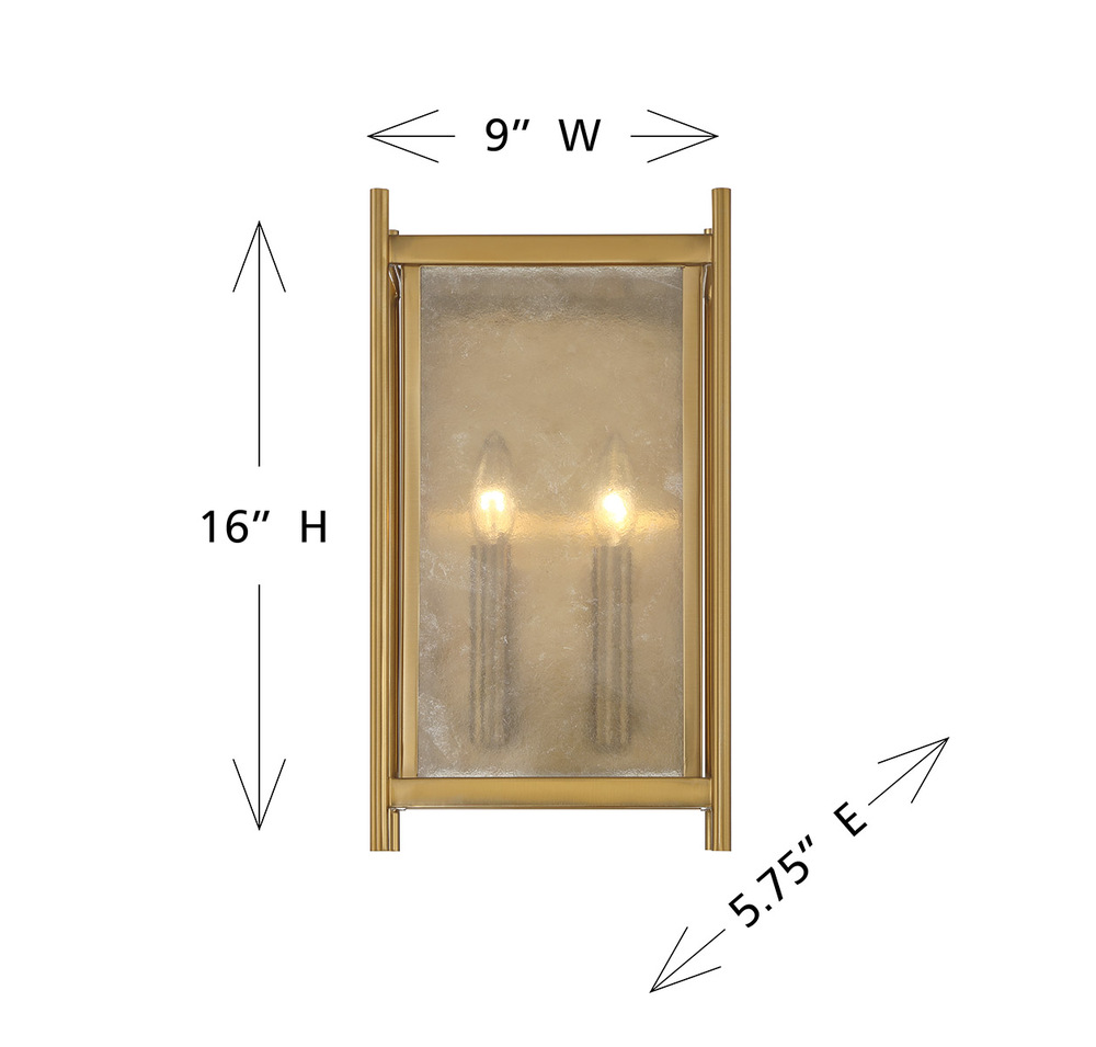 Create a warm and welcoming glow with the geometric chic Savoy House Jacobs 2-light sconce. The clear mica glass shade pairs beautifully with the Warm Brass finish and imparts eye-catching texture. Jacobs is 16" in height, 9" in width and extends 5.75" from the wall. Uses two candelabra size bulbs of up to 60 watts per bulb. Bulbs not included.