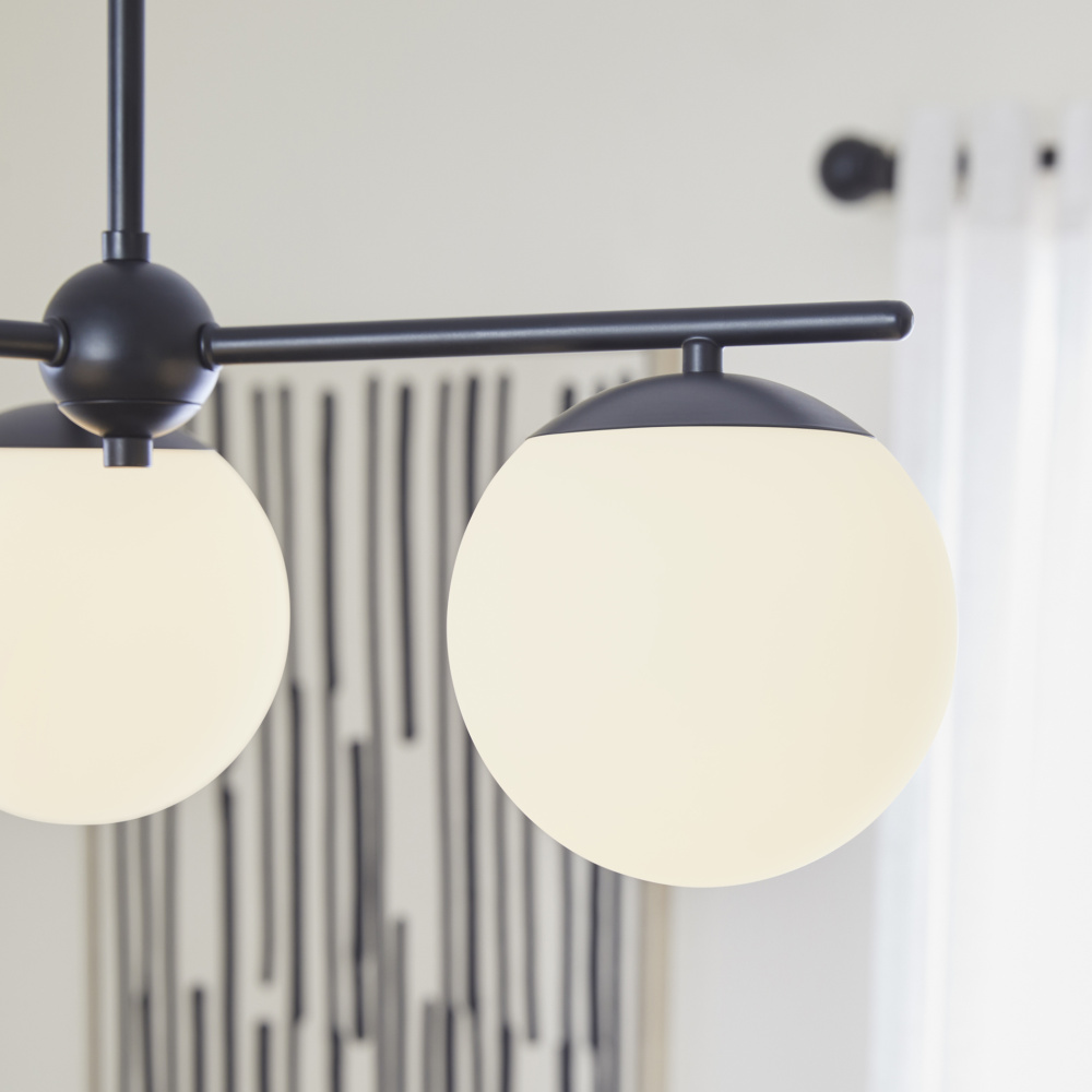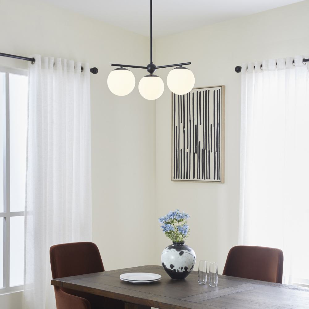 Part of the Main Street collection, the Jasper collection showcases a modern hub-and-spoke design with round globe shades and clean symmetry. Available in matte black or satin nickel and offered in both 3-light and 6-light configurations, it’s designed to suit a range of modern interiors.