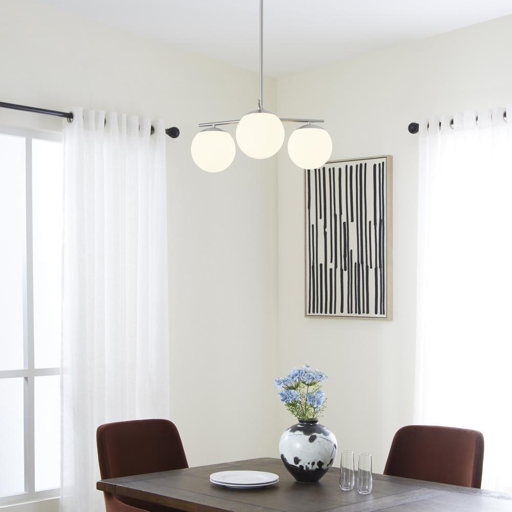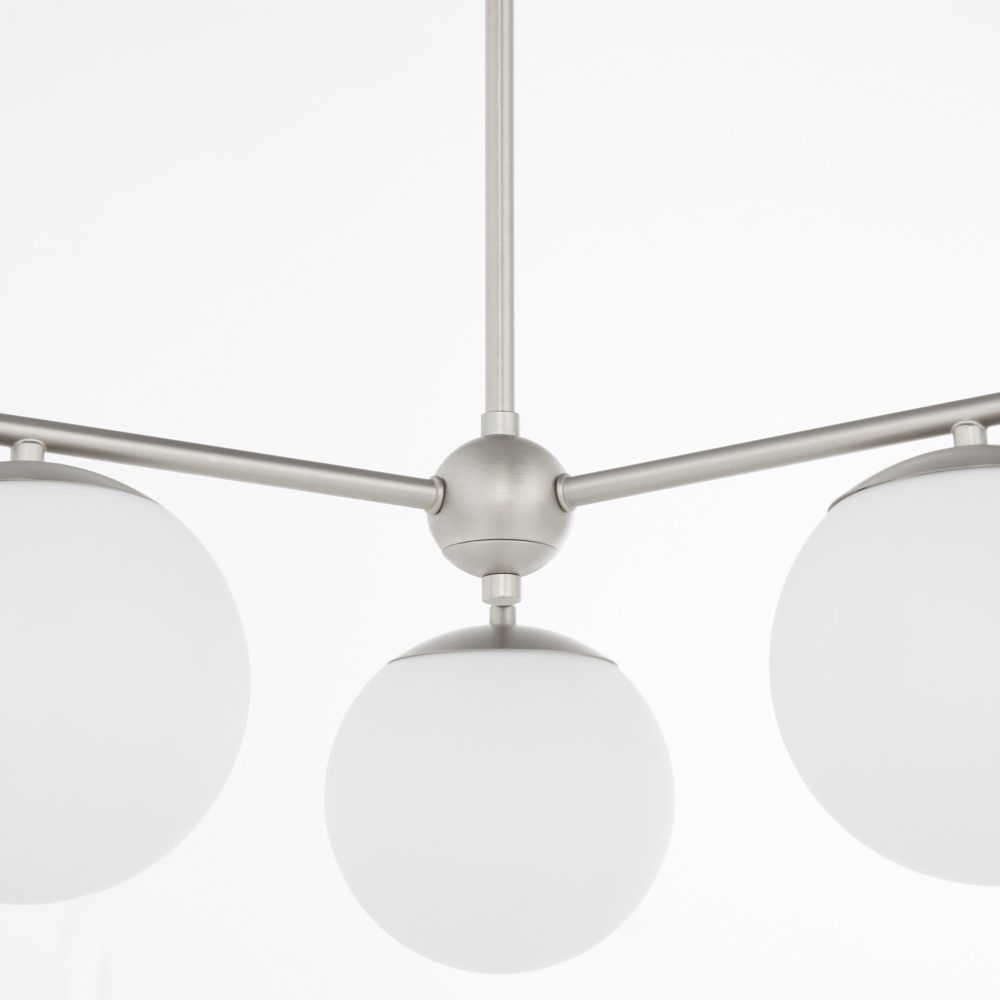 Part of the Main Street collection, the Jasper collection showcases a modern hub-and-spoke design with round globe shades and clean symmetry. Available in matte black or satin nickel and offered in both 3-light and 6-light configurations, it’s designed to suit a range of modern interiors.