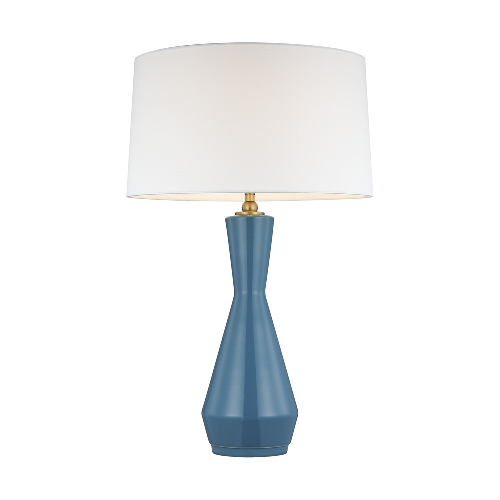 The Jens table lamp from Thomas O'Brien is simple yet bold. Jens is crafted of ceramic with a modern hourglass silhouette and accented with Burnished Brass details. The Lucent Aqua or Soft Ivory finish flows from the top to the bottom of the base. A white linen shade completes the design.