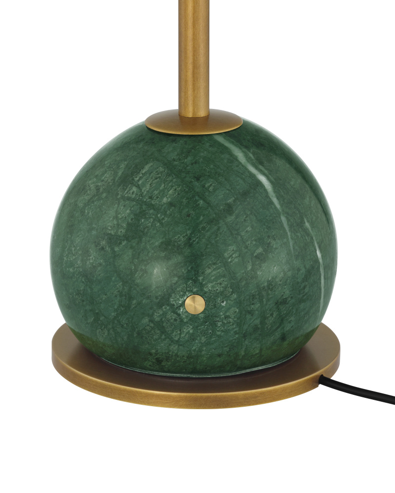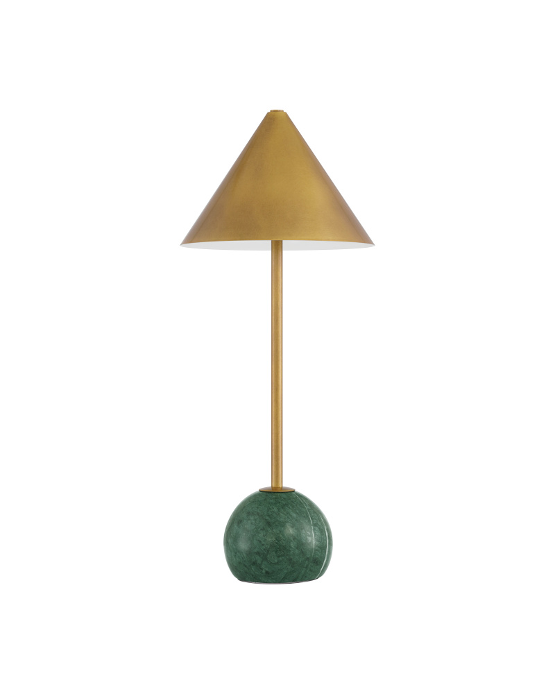 The Journey Green & Brass Cordless Table Lamp packs a fashionable punch for a portable design. The antique brass finish on the long thin stem and the cone-shaped shade brings it a subdued sophisticated gleam, while the green marble globeon the bottom anchors the piece. At less than 20 inches tall, the gold lamp has an on and off button and a battery-life indication light that alerts when it is time to recharge on the side of the base.