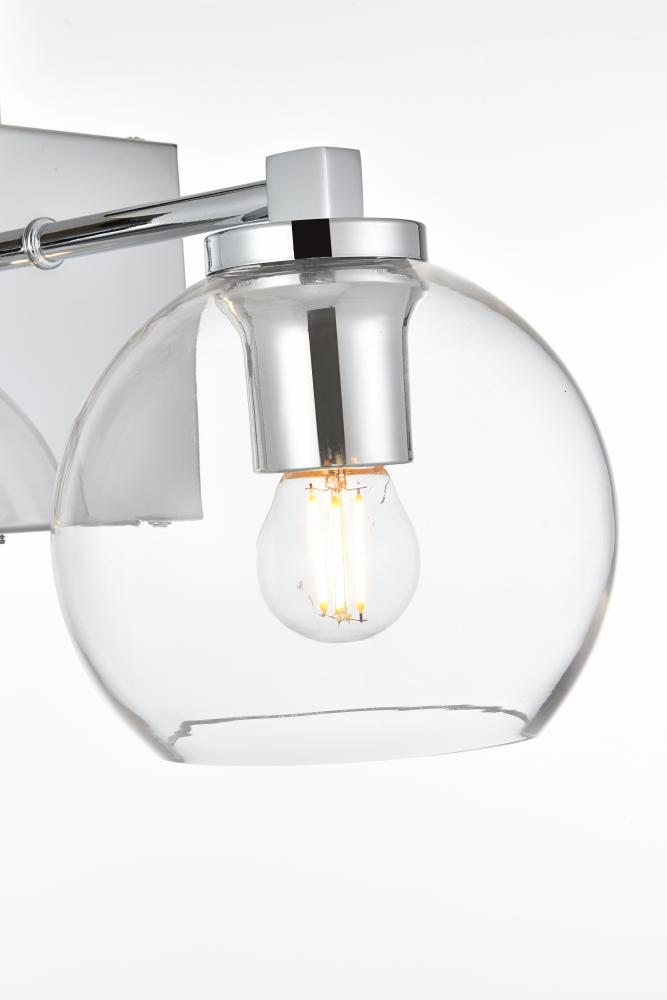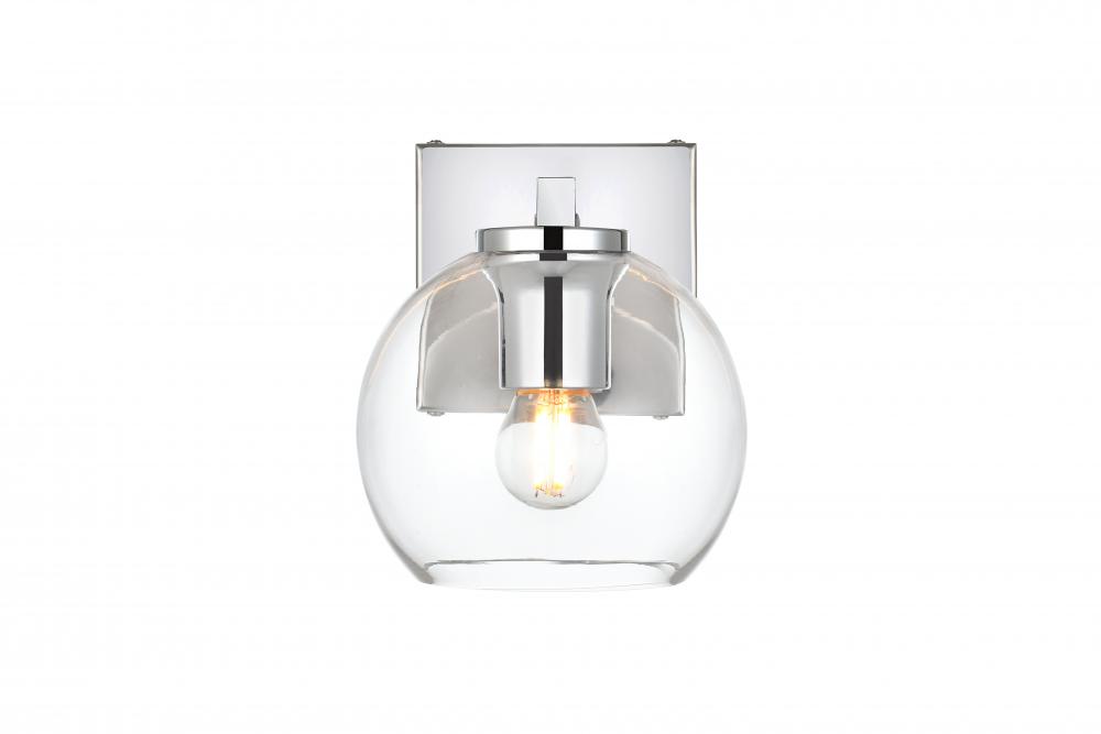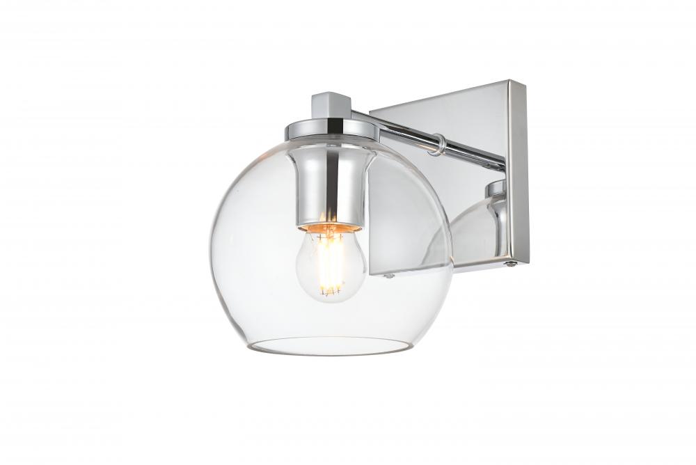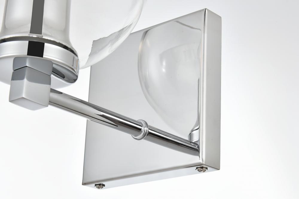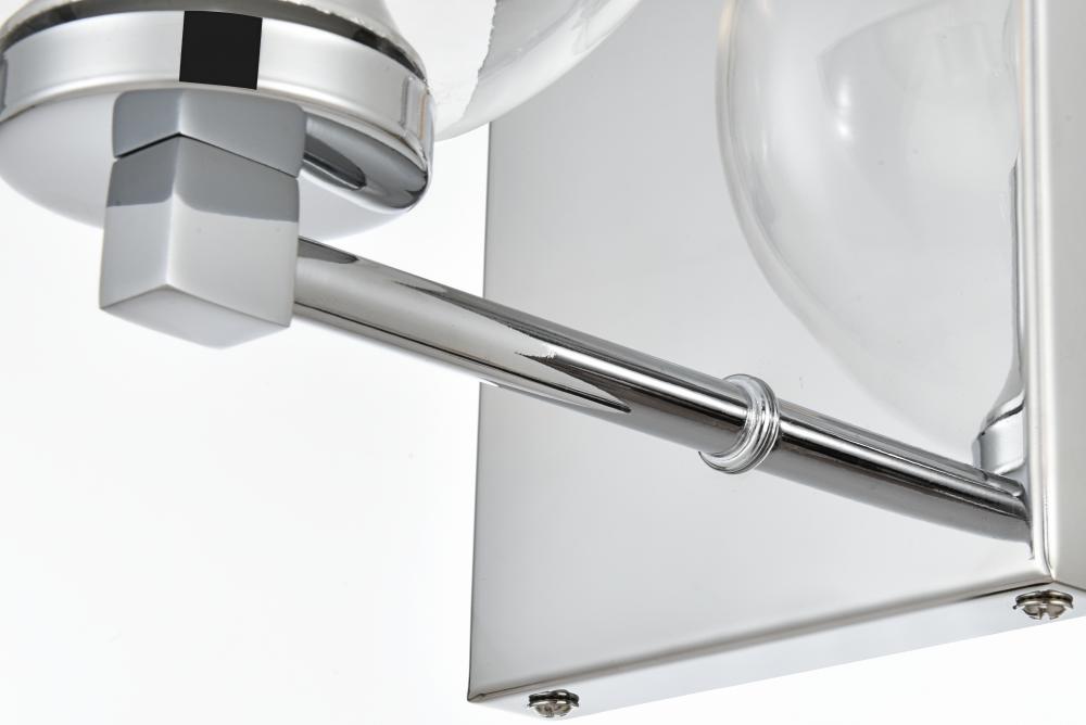 Defined by a sleek metal arm extends to suspend the clear spherical glass shade. A contemporary stunner, it shows off the straight line details from the backplate and the streamline thin metal arm. Compatible with dimmers, so you'll have the right amount of light in any given time of the day. Completely versatile, you can place this wall light as an uplight or downlight. Rated for use in damp locations, this will work perfectly over a vanity in your bathroom.