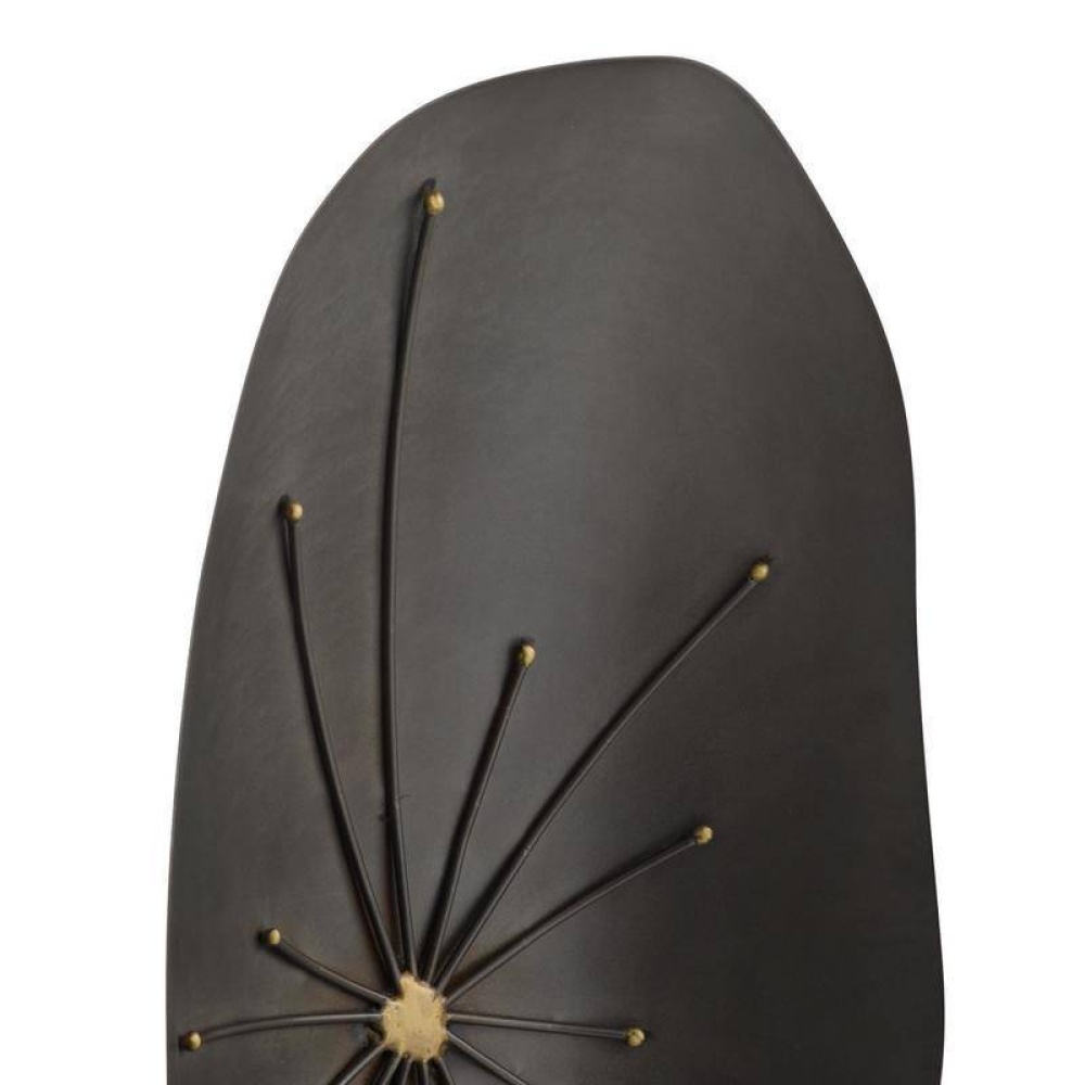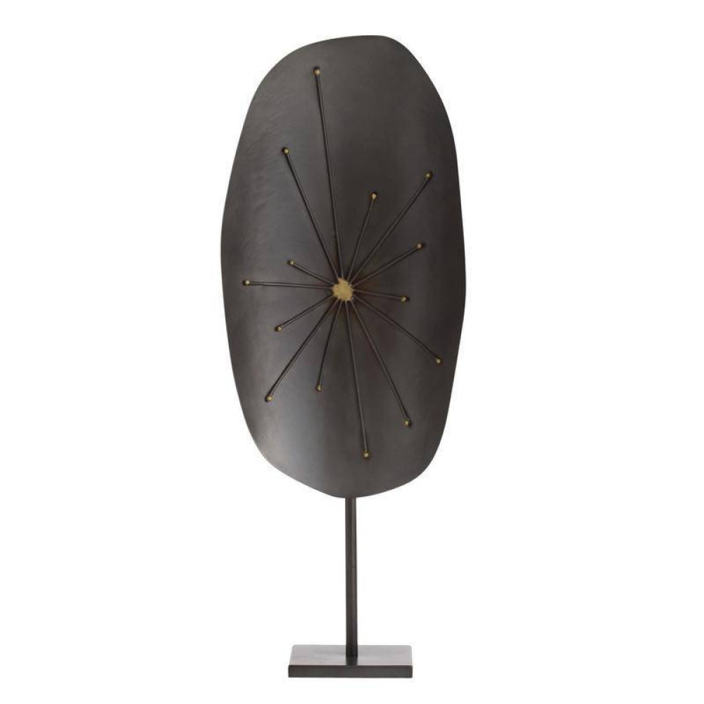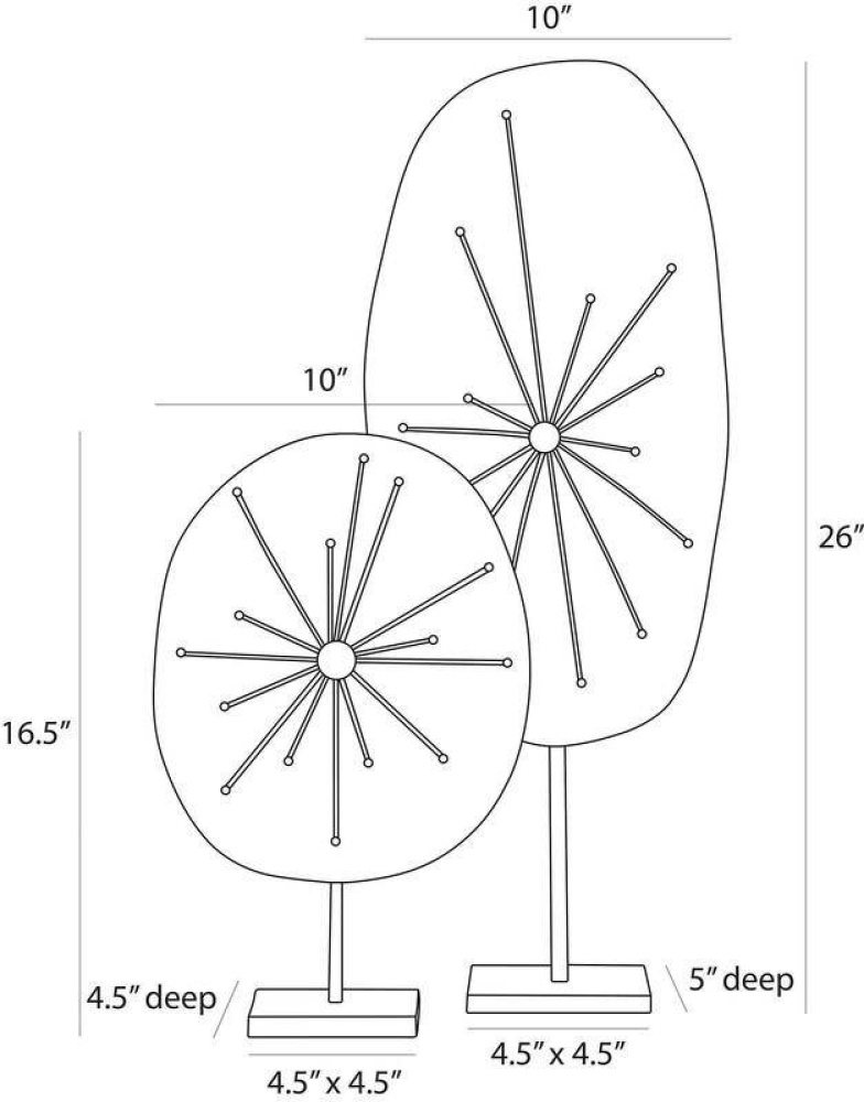 A pair of Brutalist sculptures reflect the free-form shape of a flower. Hammered forms of natural iron are accented with an antique brass tack welded at the very center for contrast. Secured on a square base, they can be displayed together or separately. Finish will vary.