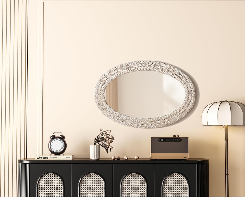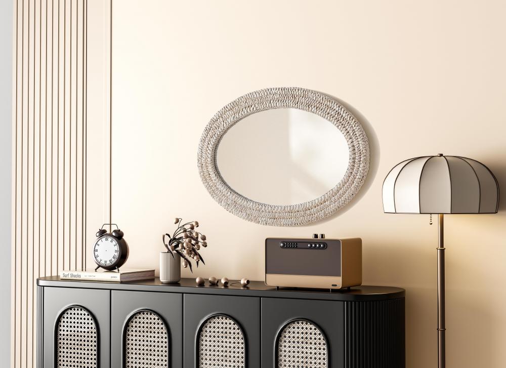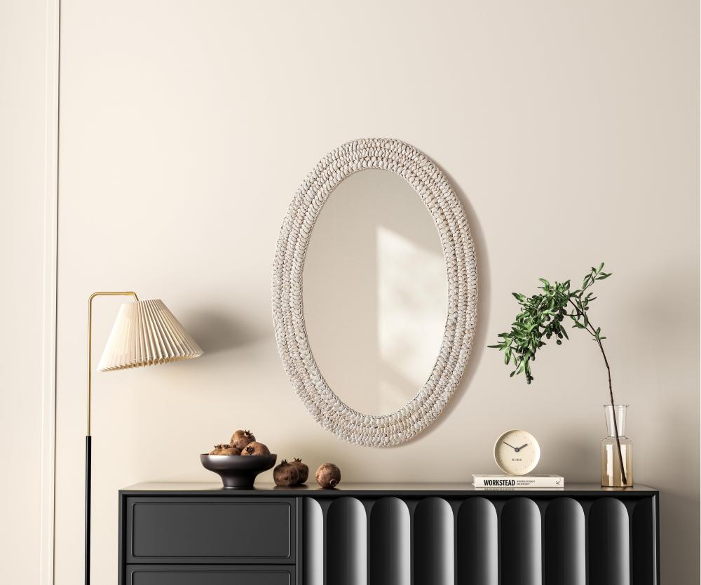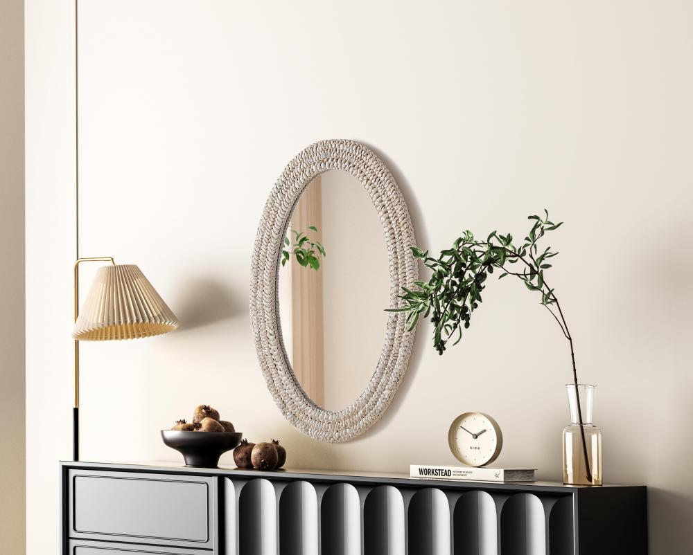 Transform your space with this stunning wall mirror that blends natural charm with functional design. Crafted from MDF, cornhusk, and high-quality mirror, the textured woven frame brings warmth and character to your decor. Whether you're decorating a hallway, living room, or bedroom, this mirror comes in a variety of shapes—including rectangle, round, oval, and arch—along with multiple size options to perfectly suit your needs. Designed for versatility, the mirror features three inset metal hangers, allowing you to mount it either vertically or horizontally with ease. Its reflective surface not only adds a touch of brightness but also creates the illusion of a larger room, enhancing your space. with durable materials and ready-to-hang hardware, this mirror is as practical as it is stylish, making it a must-have piece for any home.