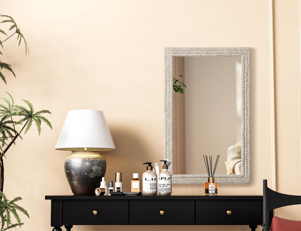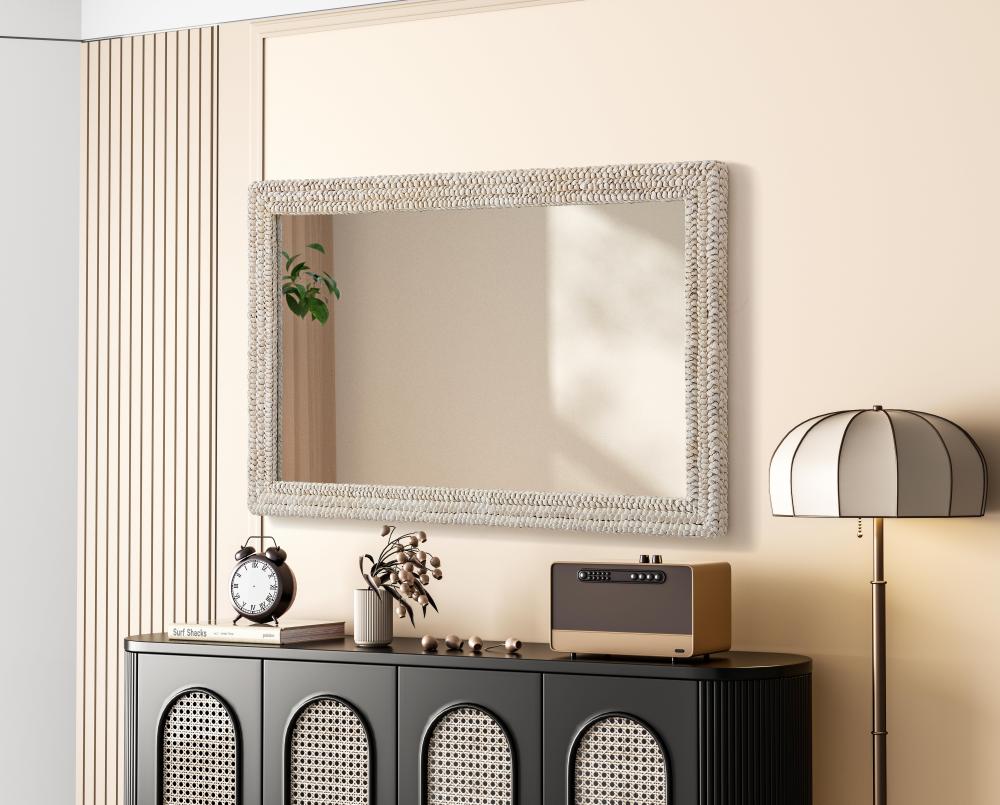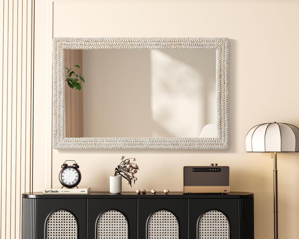 Transform your space with this stunning wall mirror that blends natural charm with functional design. Crafted from MDF, cornhusk, and high-quality mirror, the textured woven frame brings warmth and character to your decor. Whether you're decorating a hallway, living room, or bedroom, this mirror comes in a variety of shapes—including rectangle, round, oval, and arch—along with multiple size options to perfectly suit your needs. Designed for versatility, the mirror features four inset metal hangers, allowing you to mount it either vertically or horizontally with ease. Its reflective surface not only adds a touch of brightness but also creates the illusion of a larger room, enhancing your space. with durable materials and ready-to-hang hardware, this mirror is as practical as it is stylish, making it a must-have piece for any home.