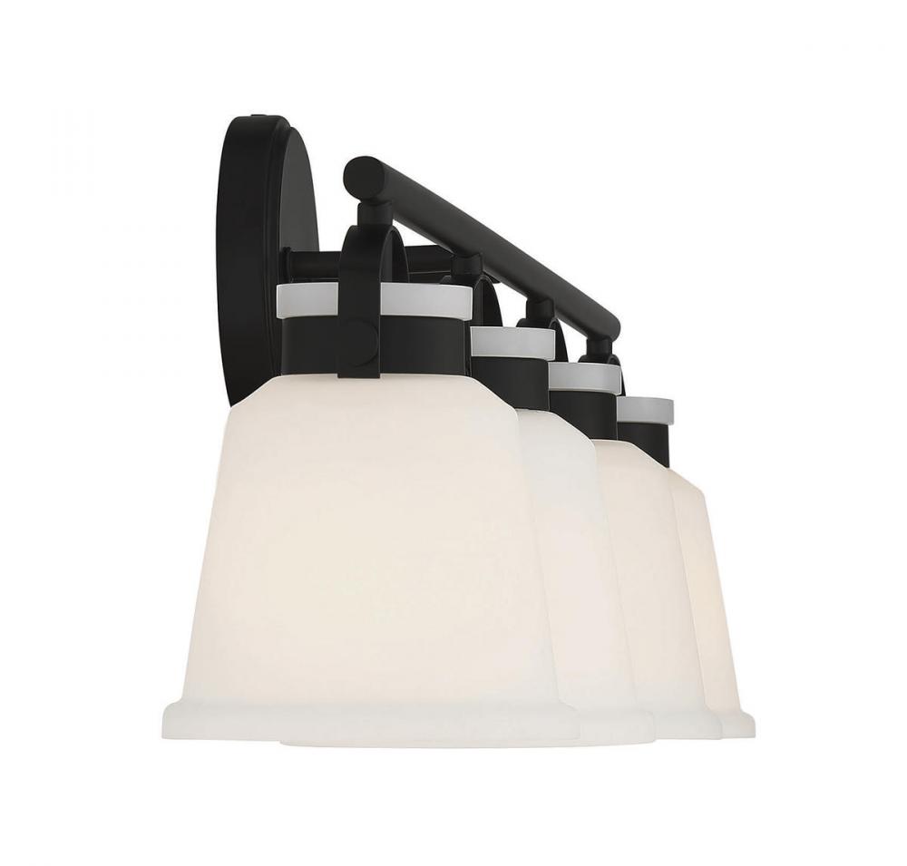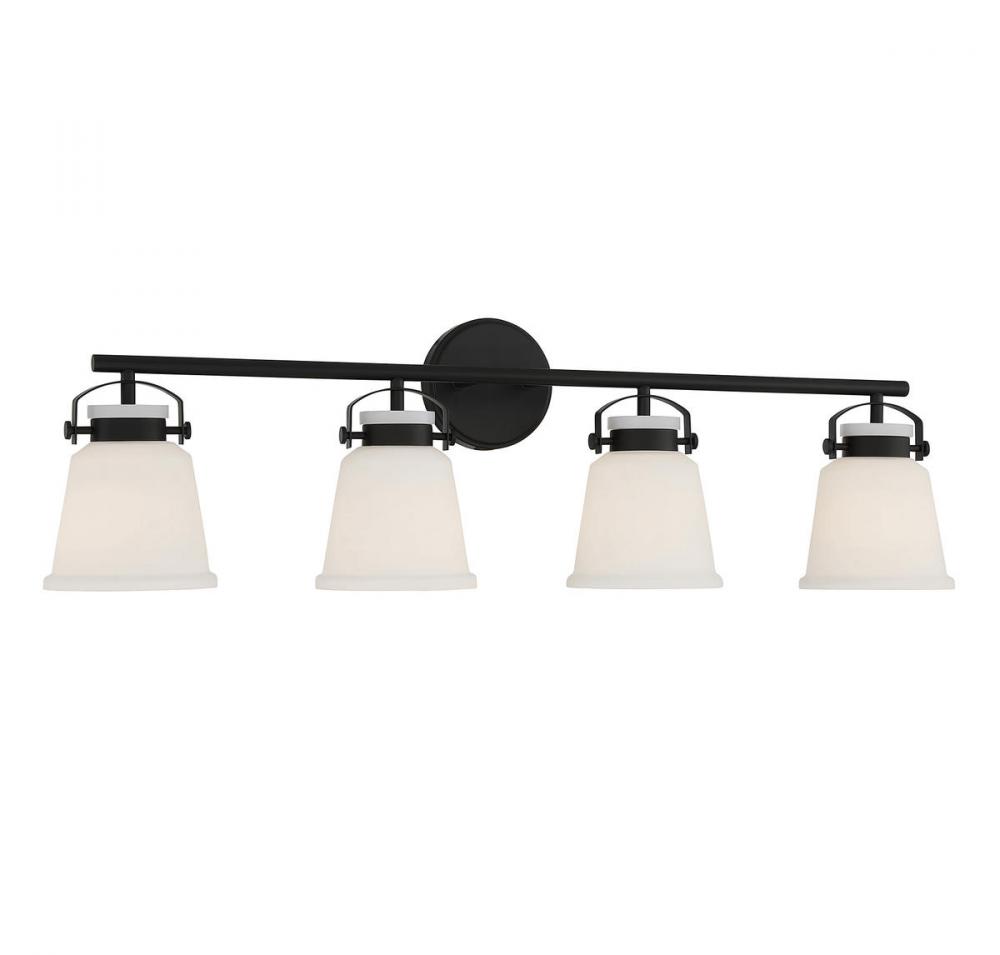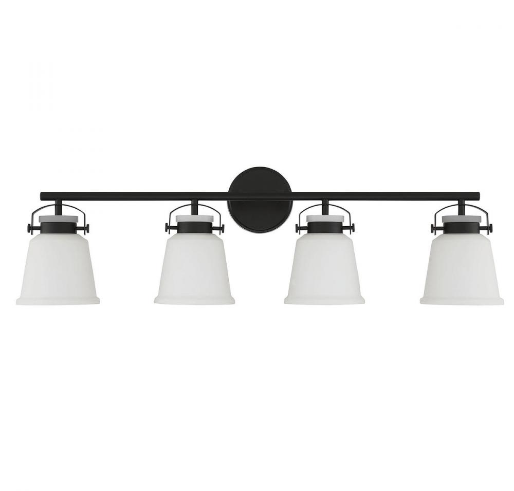 The Kaden 4-light bathroom vanity light from Savoy House has a classic look with a hint of industrial inspiration. White opal glass shades are held in place with eye-catching hardware that, like the bar and backplate, is finished in matte black. Kaden is 10.5" in height, 34" in width and extends 7" from the wall. It uses four standard size bulbs with a max of 60 watts per bulb. Damp area rated.