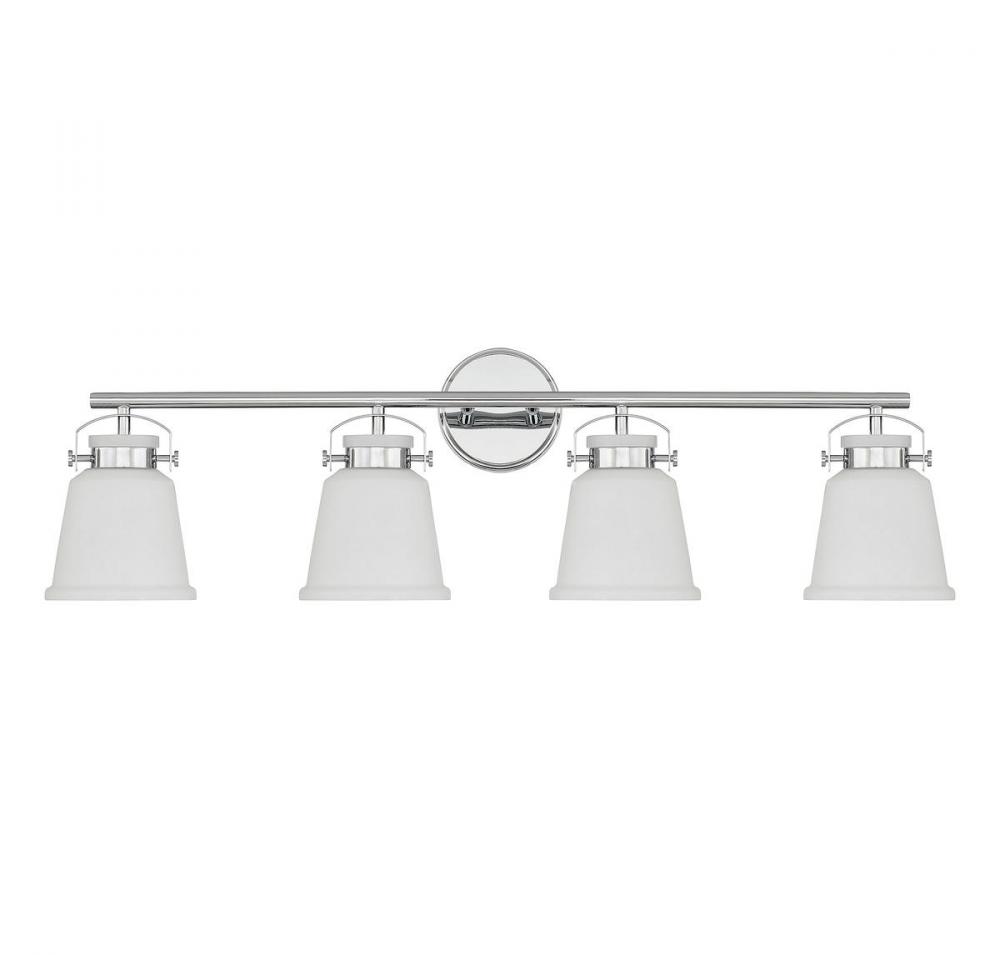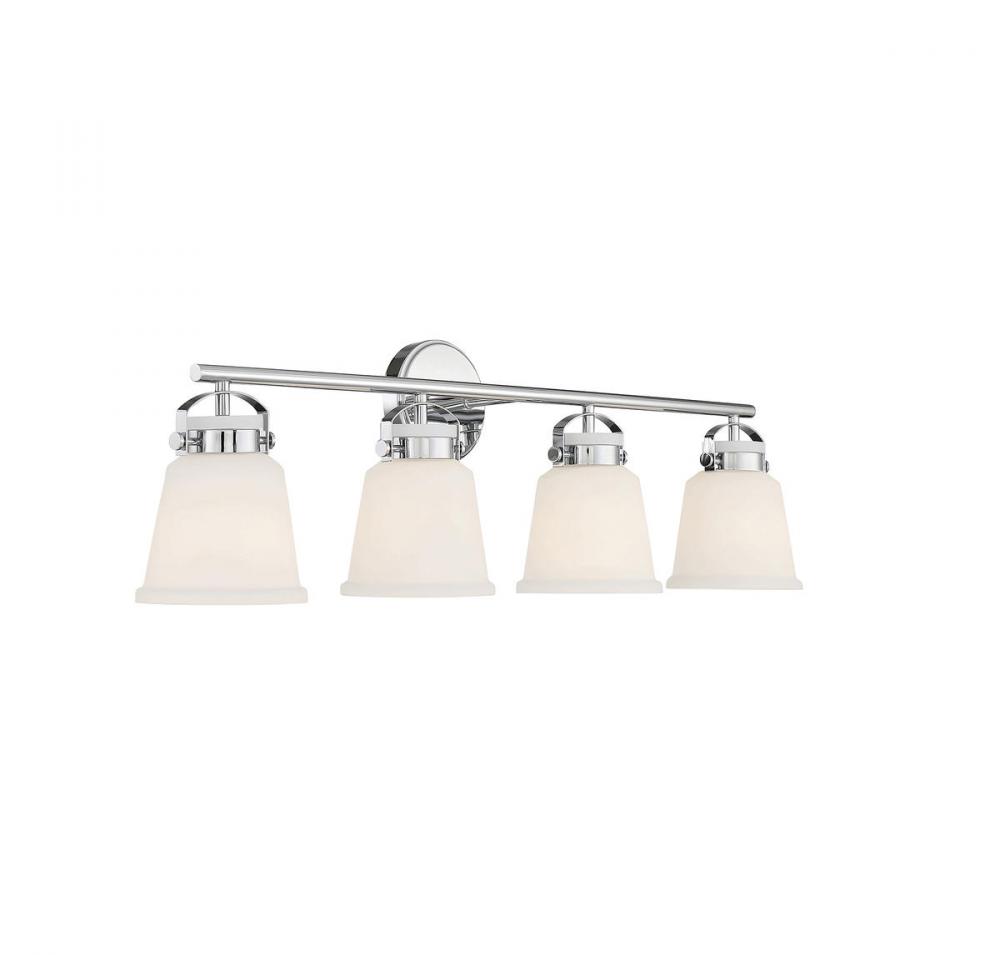 The Kaden 4-light bathroom vanity light from Savoy House has a classic look with a hint of industrial inspiration. White opal glass shades are held in place with eye-catching hardware that, like the bar and backplate, is finished in polished chrome. Kaden is 10.5" in height, 34" in width and extends 7" from the wall. It uses four standard size bulbs with a max of 60 watts per bulb. Damp area rated.