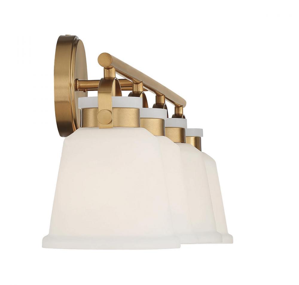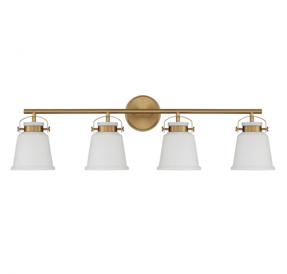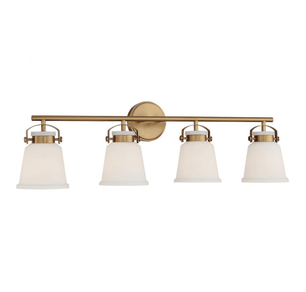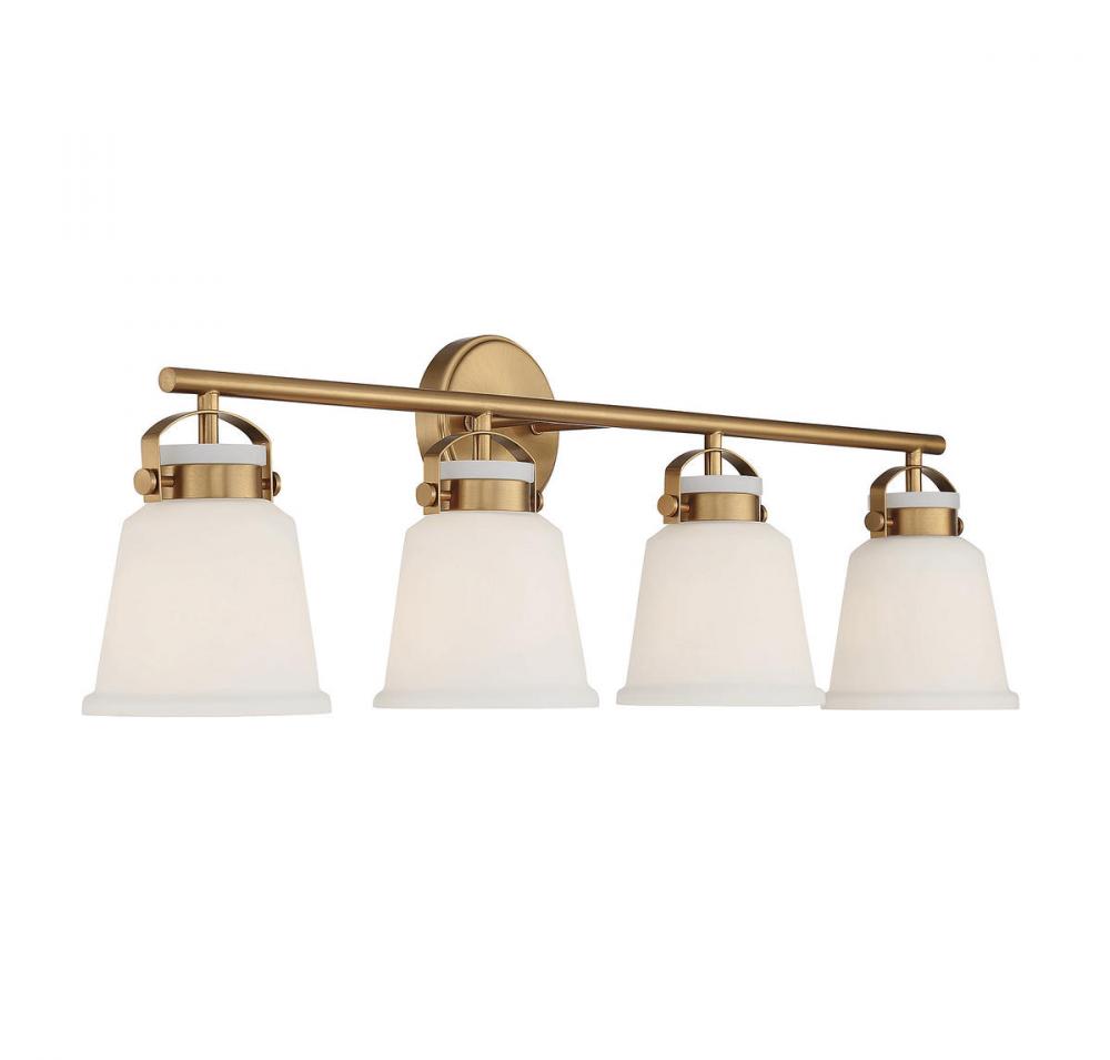 The Kaden 4-light bathroom vanity light from Savoy House has a classic look with a hint of industrial inspiration. White opal glass shades are held in place with eye-catching hardware that, like the bar and backplate, is finished in warm brass. Kaden is 10.5" in height, 34" in width and extends 7" from the wall. It uses four standard size bulbs with a max of 60 watts per bulb. Damp area rated.