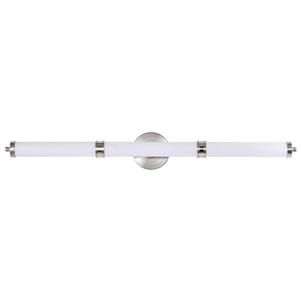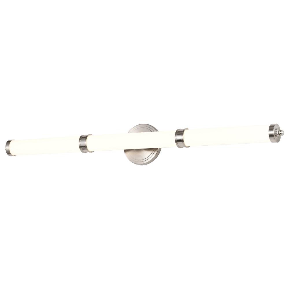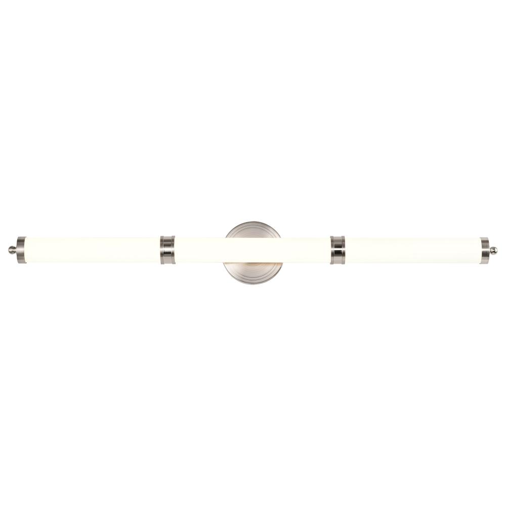 The Kagen 62-1536 integrated LED large vanity light is a stylish and modern lighting fixture. The brushed nickel finish provides a sleek and contemporary look, and the white acrylic lens creates a soft and diffused light that is perfect for a bathroom sett