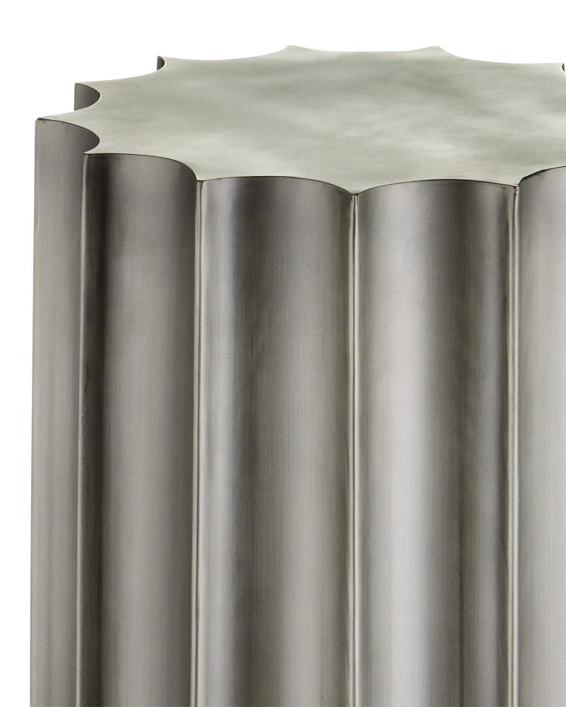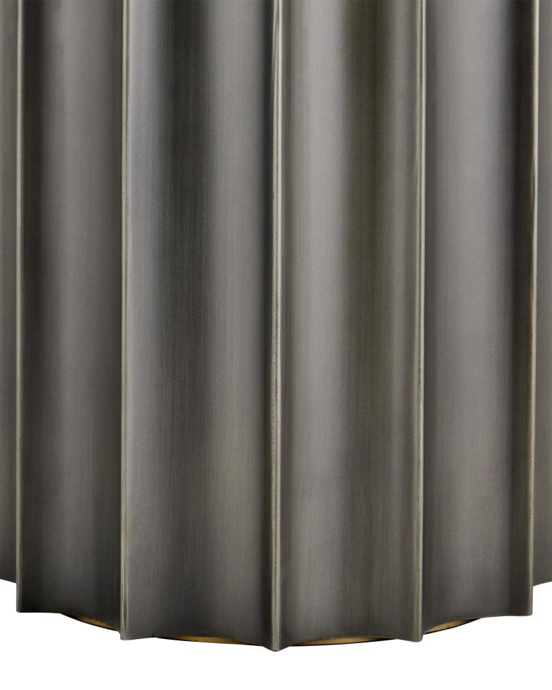 Made of iron in a graphite finish with a subtle ombré effect, the surface of the Kanti Pedestal darkens as it moves toward the bottom. The gray pedestal, that will support a sculpture or an oversized vase, has an ample dose of personality for an accessory because its fluted shape brings both the sides and the top added interest. The bottom of the pedestal is covered in felt to keep it from damaging any underlying surfaces.