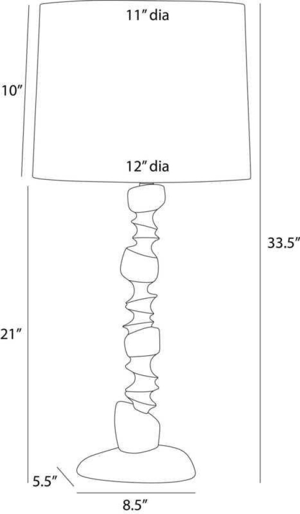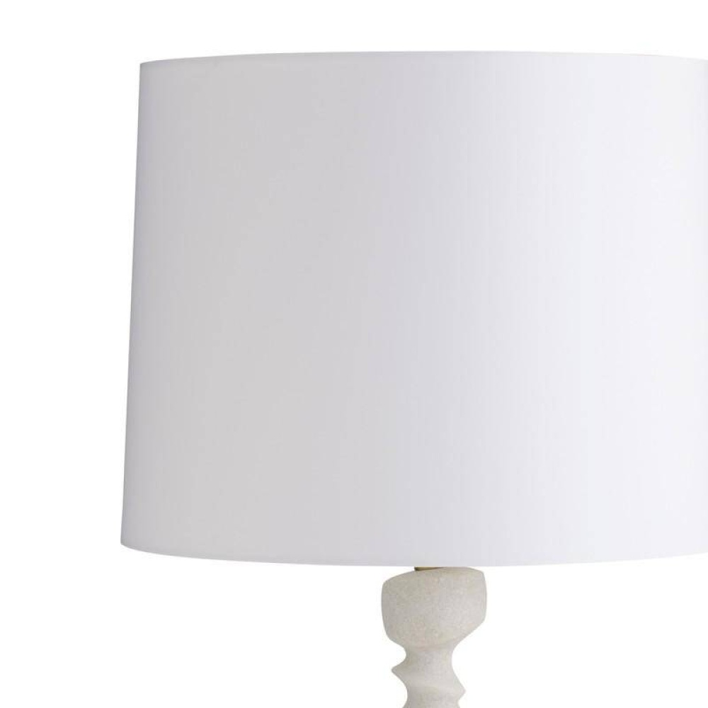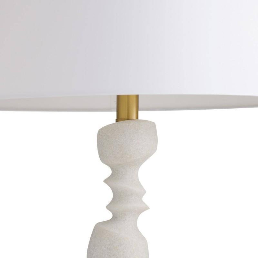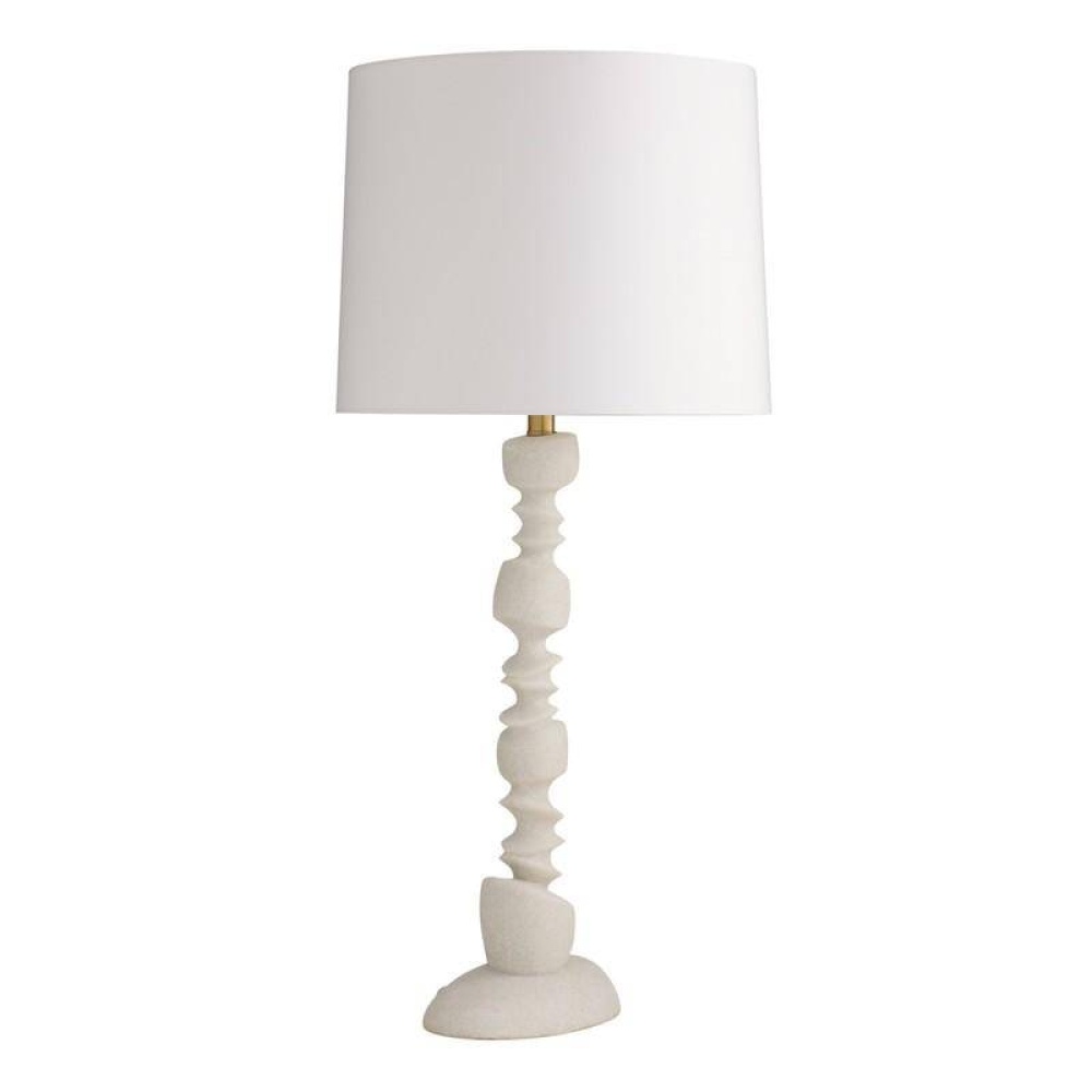 This modern totemic sculpture offers illumination along with its rhythmic shape. Reminiscent of stacked river stones, the ivory ricestone composite base delivers an implied movement that is even more dynamic when displayed in a pair on a console or credenza. Topped with an off-white linen drum shade and lined in off-white cotton. Finished with an antique brass hardware and finial. Finish will vary.