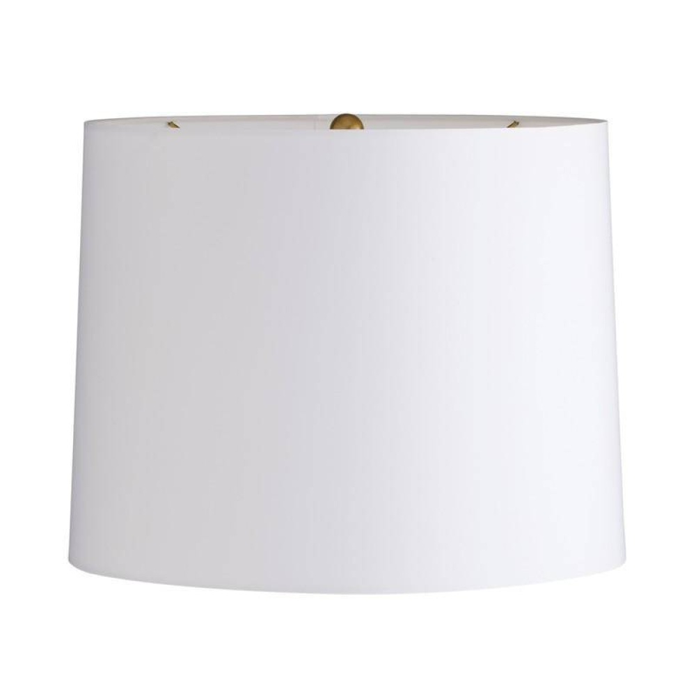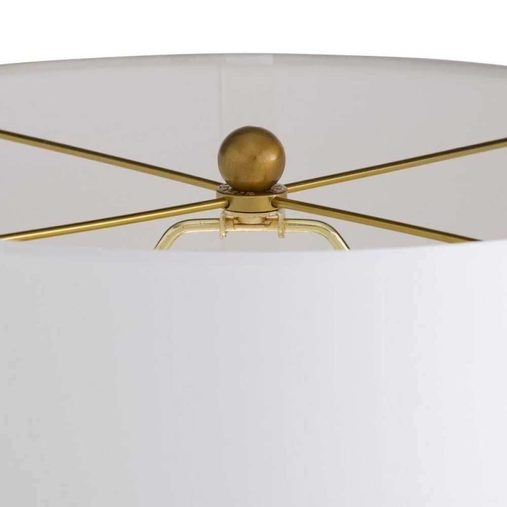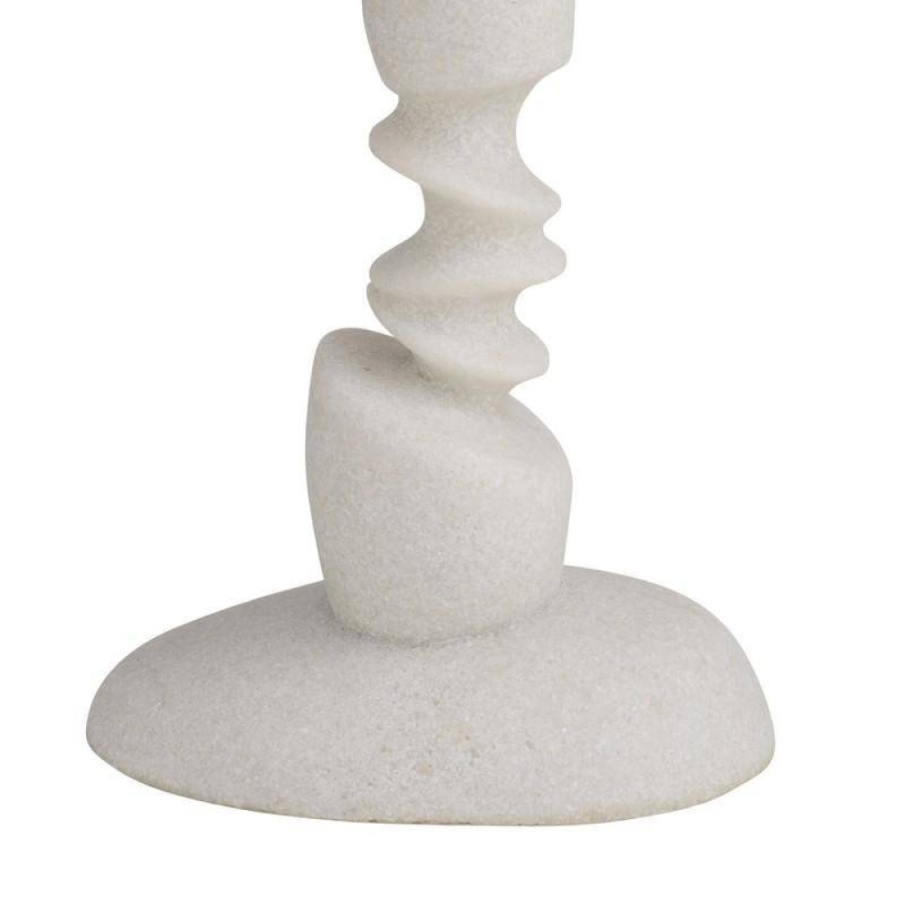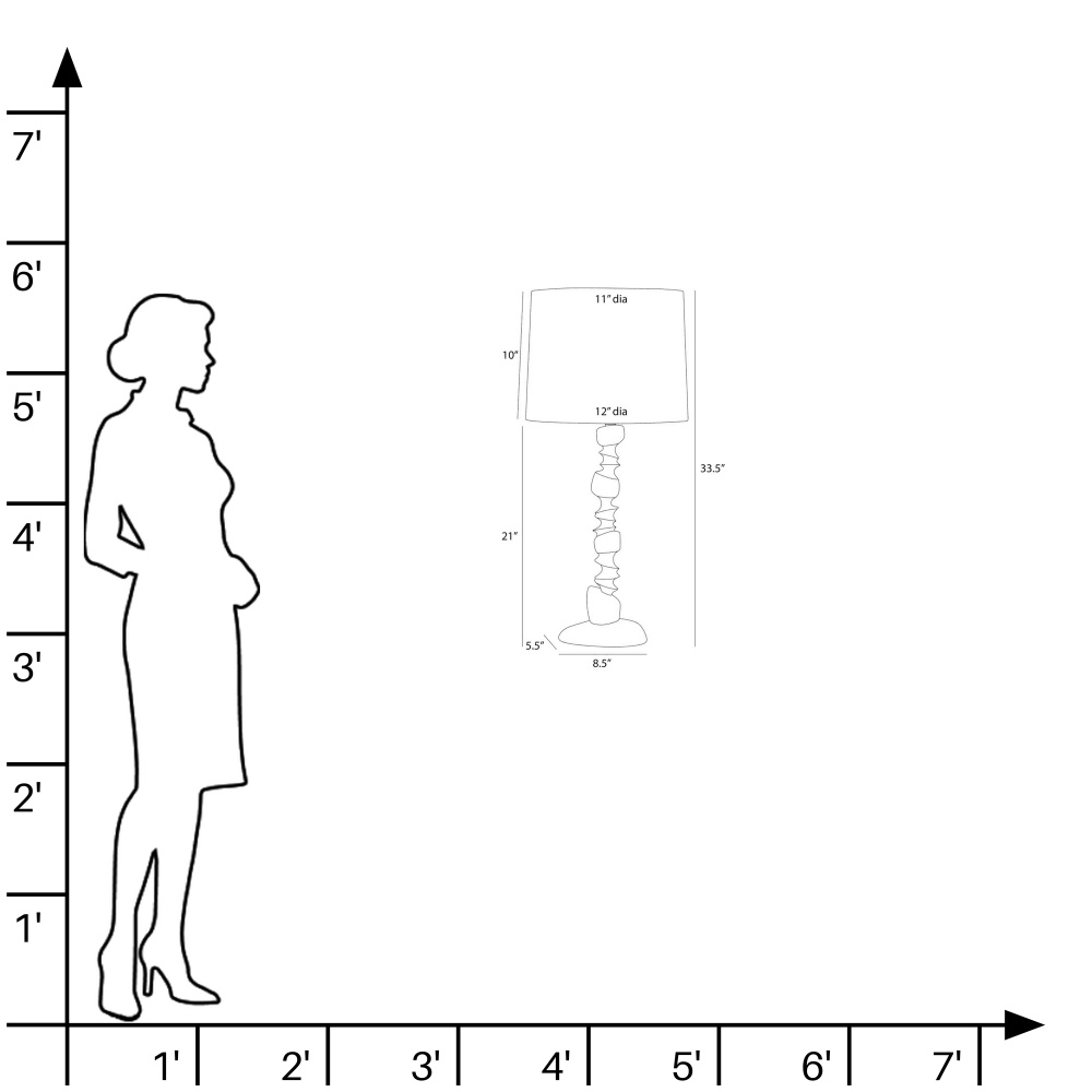 This modern totemic sculpture offers illumination along with its rhythmic shape. Reminiscent of stacked river stones, the ivory ricestone composite base delivers an implied movement that is even more dynamic when displayed in a pair on a console or credenza. Topped with an off-white linen drum shade and lined in off-white cotton. Finished with an antique brass hardware and finial. Finish will vary.