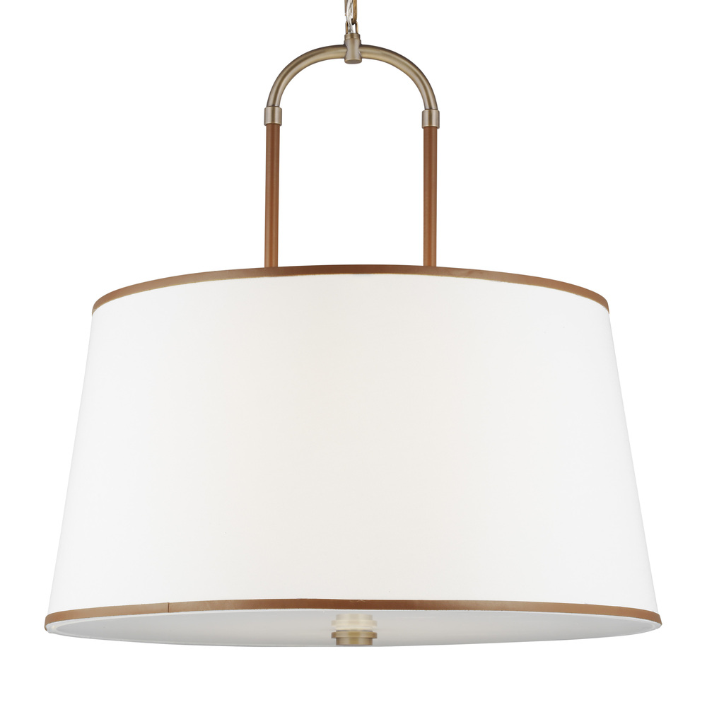 The Katie four-light shade pendant leather straps contrast with metal and white linen fabric shade to round out a timeless design. Available in: Time Worn Brass with Brown Leather or Polished Nickel with Black Leather. The combination of leather and steel gives this round chandelier equestrian flair.
