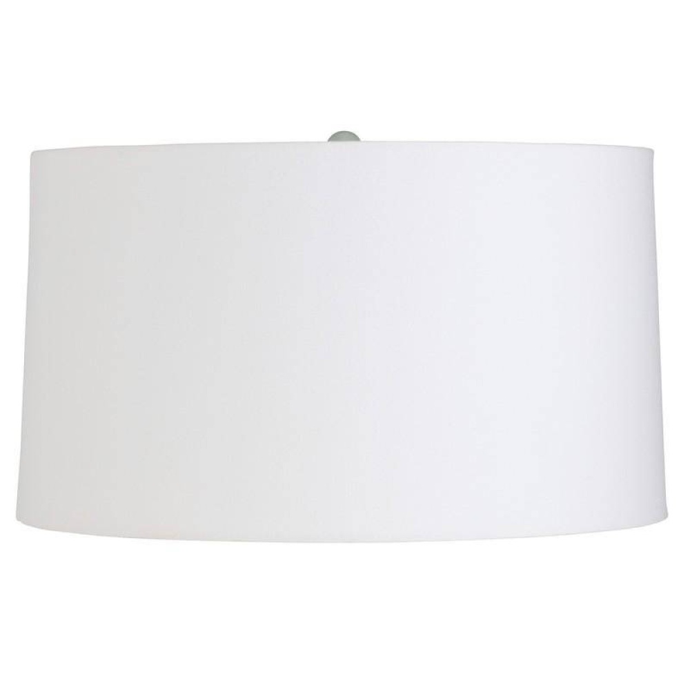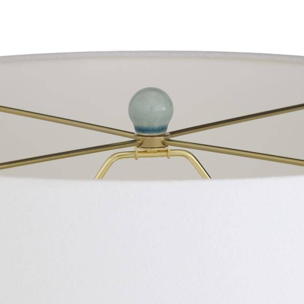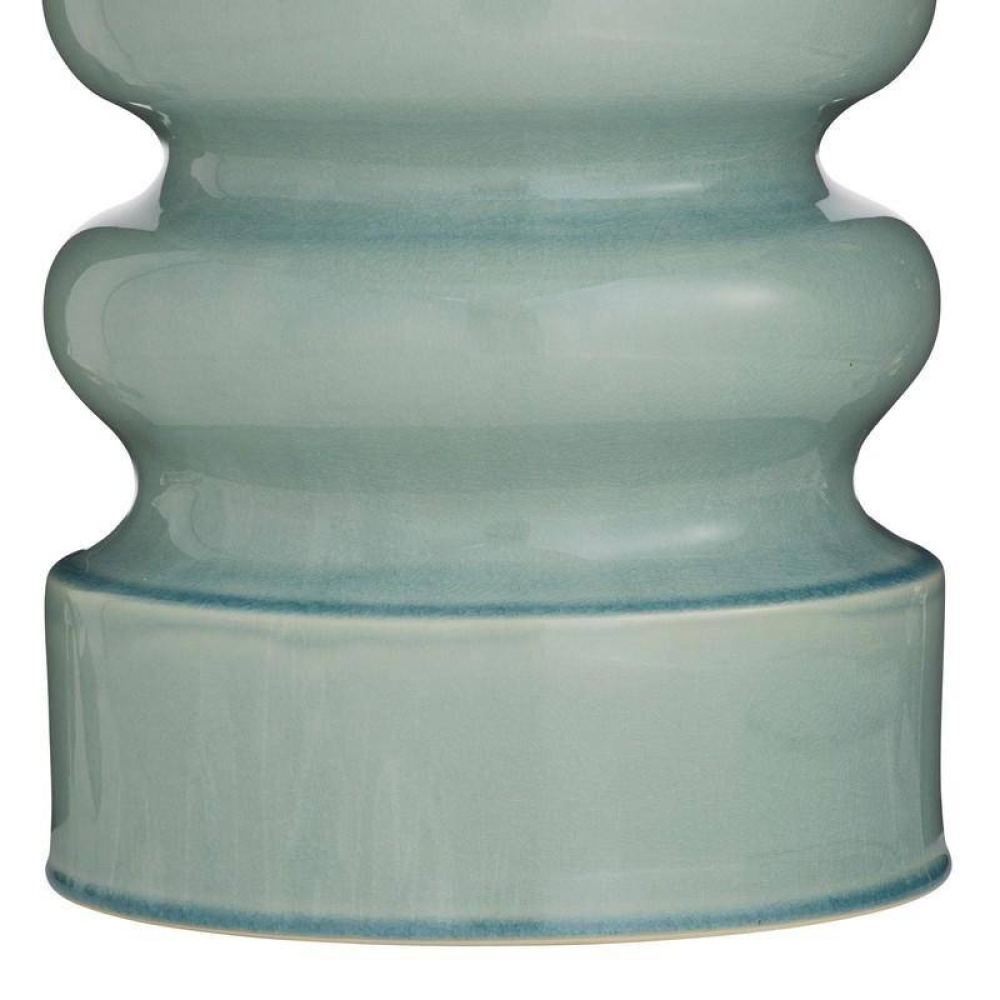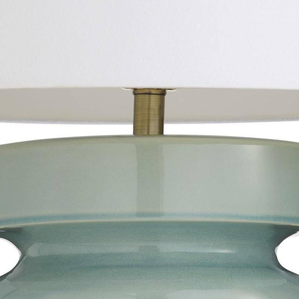 An undulating oversized porcelain lamp glazed in a celadon shade. Topped with a white linen drum shade and lined in white cotton and antique brass sphere finial. Finish will vary.