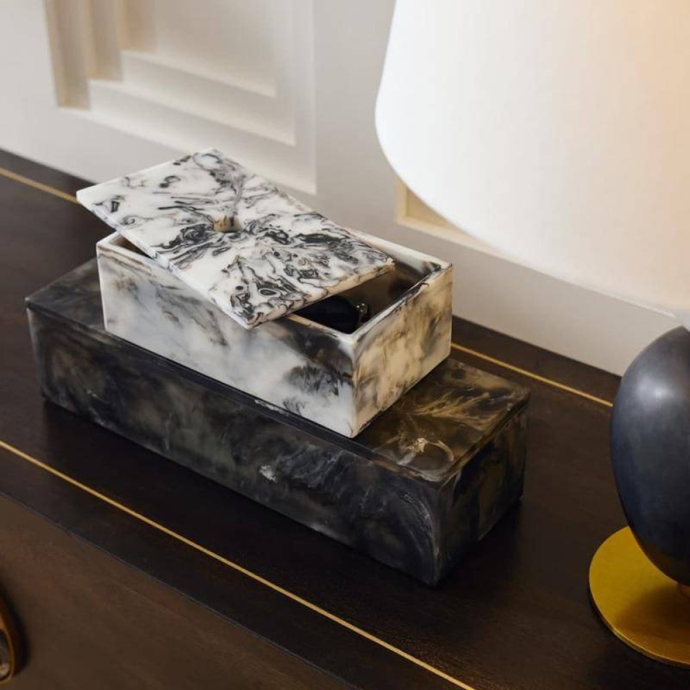 Inspired by classic nesting boxes, this pair of containers deliver a marble-like effect. This stylish set plays with the contrast of black and white swirled resin, and each will have its own distinct pattern. A small round opening in each lid allows for easy lifting. Finish will vary.