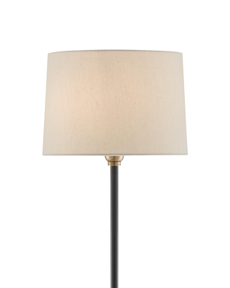 The Keeler Floor Lamp rises from a straightforward block to a basic cone shape that holds a long thin stem. The materials the brass floor lamp is made from are also unpretentious: cast aluminum in an antique brass finish and iron in a black nickel finish. Topping this study in understated style is a tan shantung shade.