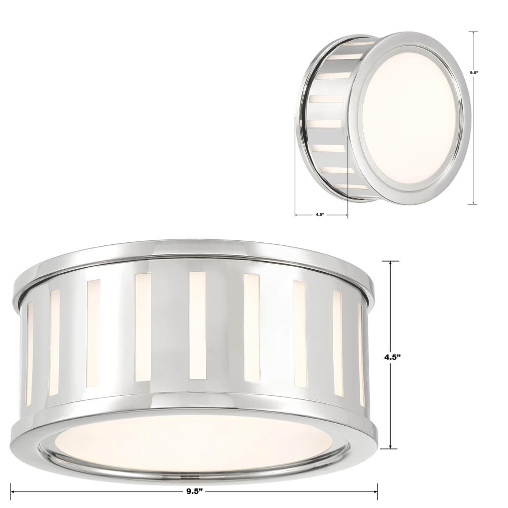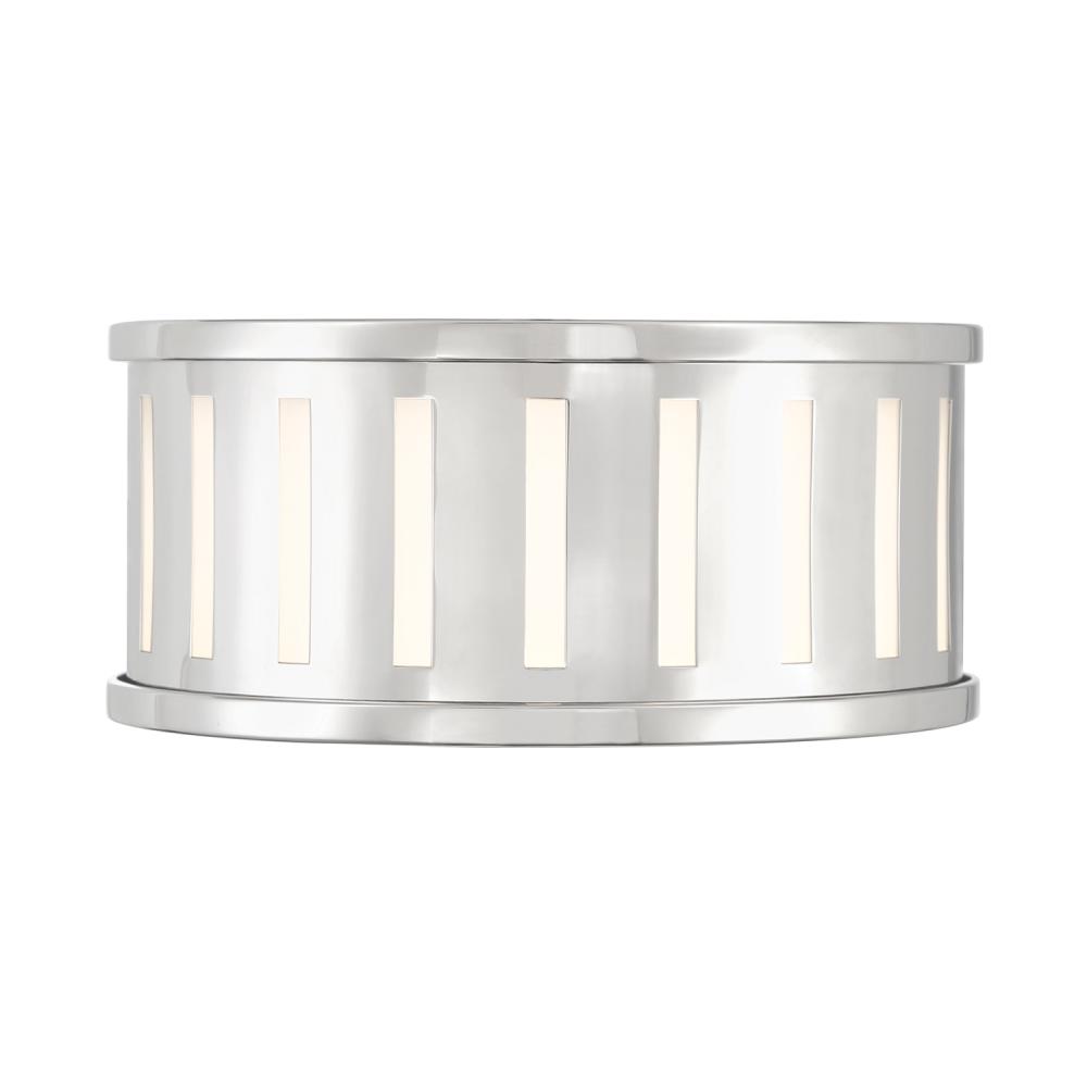 The contemporary Kendal collection makes a statement with its graphic uniform pattern. Its metal frame surrounds white glass in this elegant drum-shaped ceiling mount. The high contrast of Vibrant Gold, Black Forged, or Polished Nickel against white glass is a great way to add a touch of drama to a room.