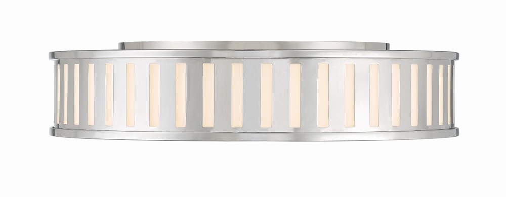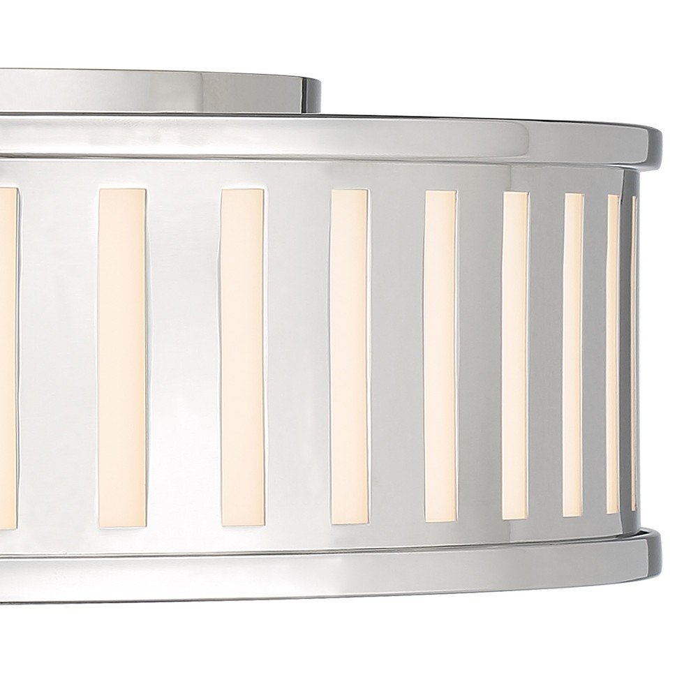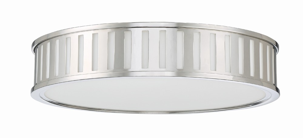 The contemporary Kendal collection makes a statement with its graphic uniform pattern. Its metal frame surrounds white glass in this elegant drum-shaped ceiling mount. The high contrast of Vibrant Gold, Black Forged, or Polished Nickel against white glass is a great way to add a touch of drama to a room.