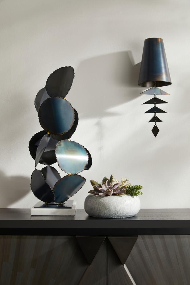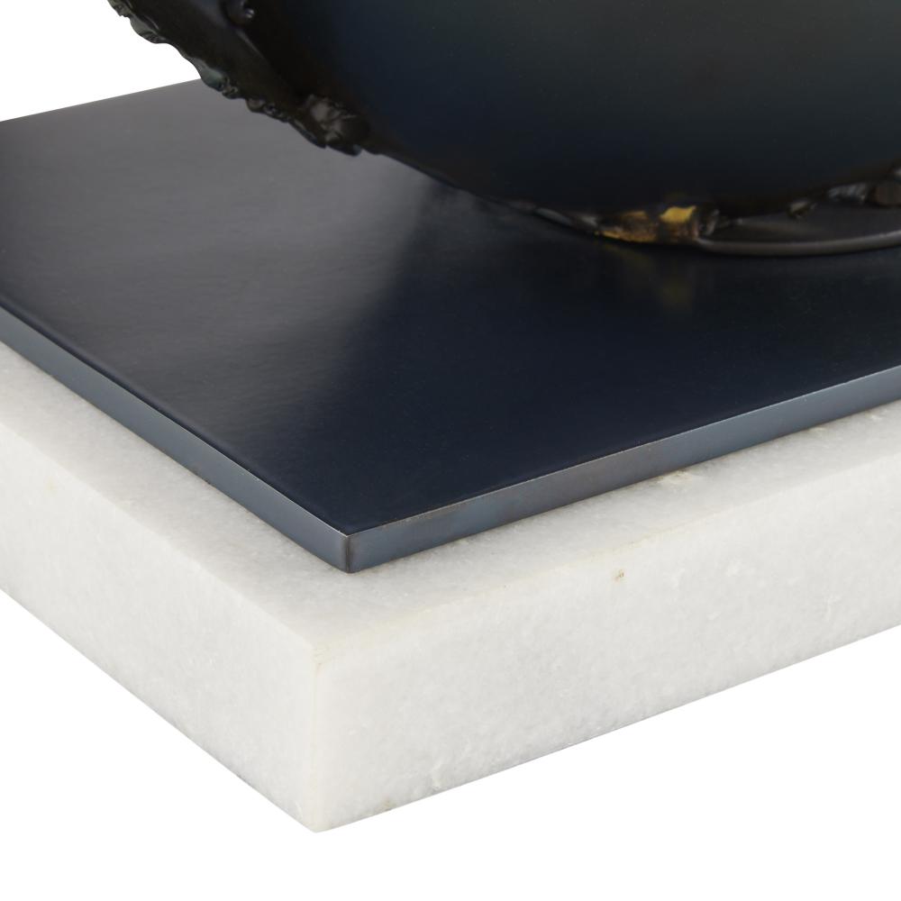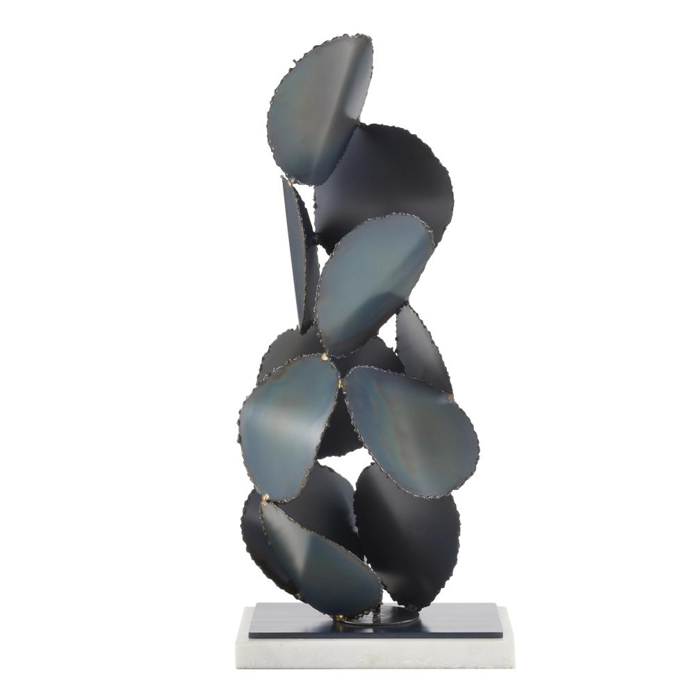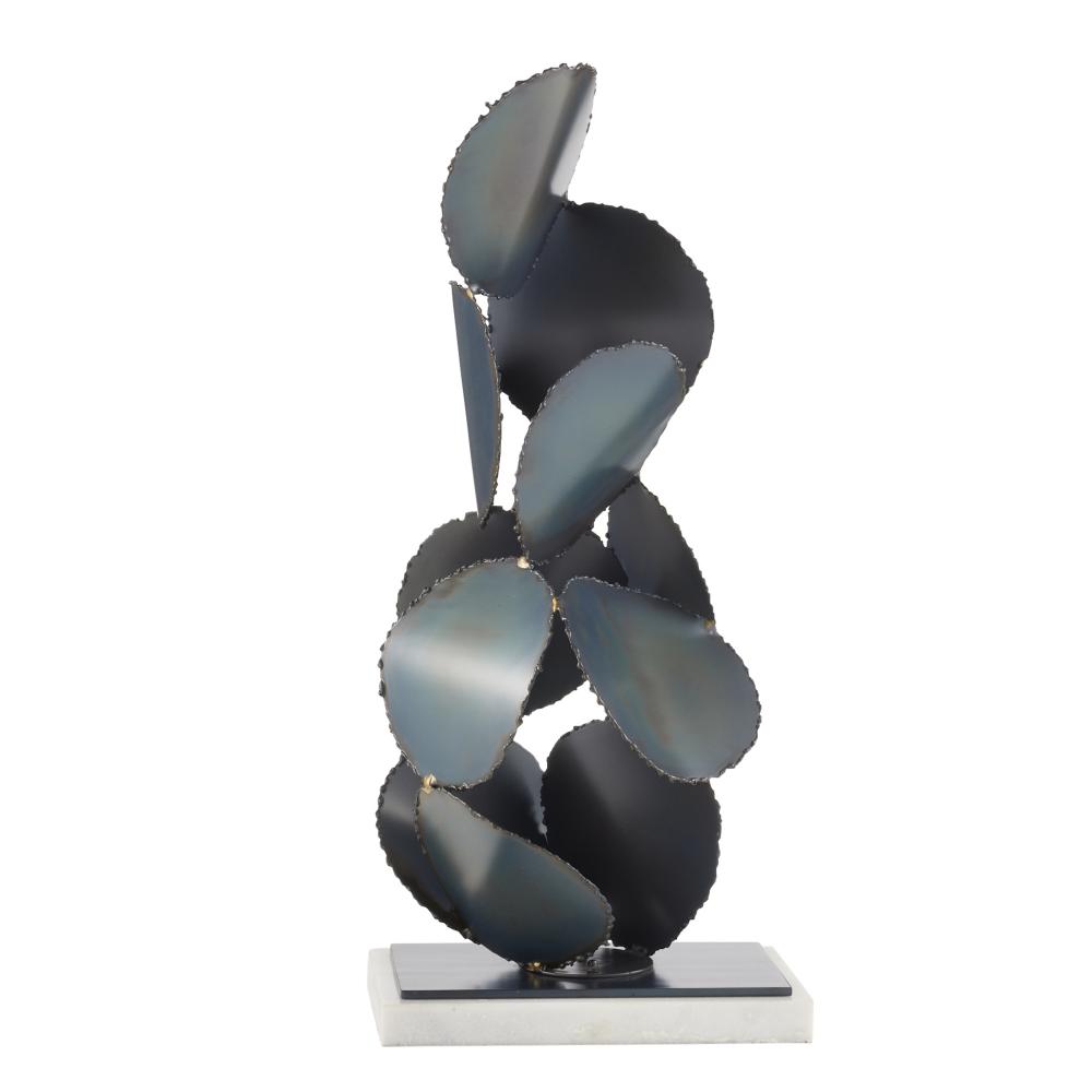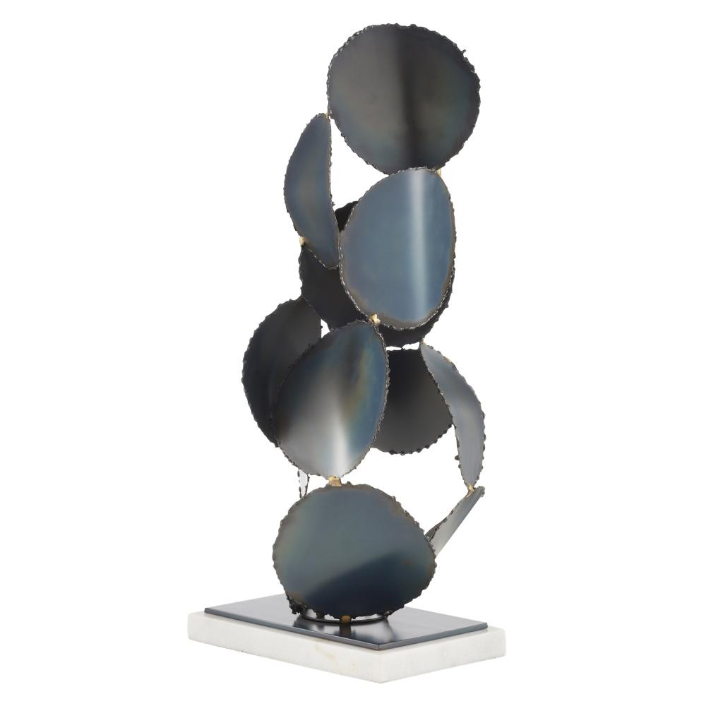 Freeform discs of burnt iron gather in a gravity-defying form inspired by the best of Brutalist sculpture. Conveying a feeling of constant movement, this sculpture’s purity of line is enhanced by a square base of iron and white marble. Finish will vary.