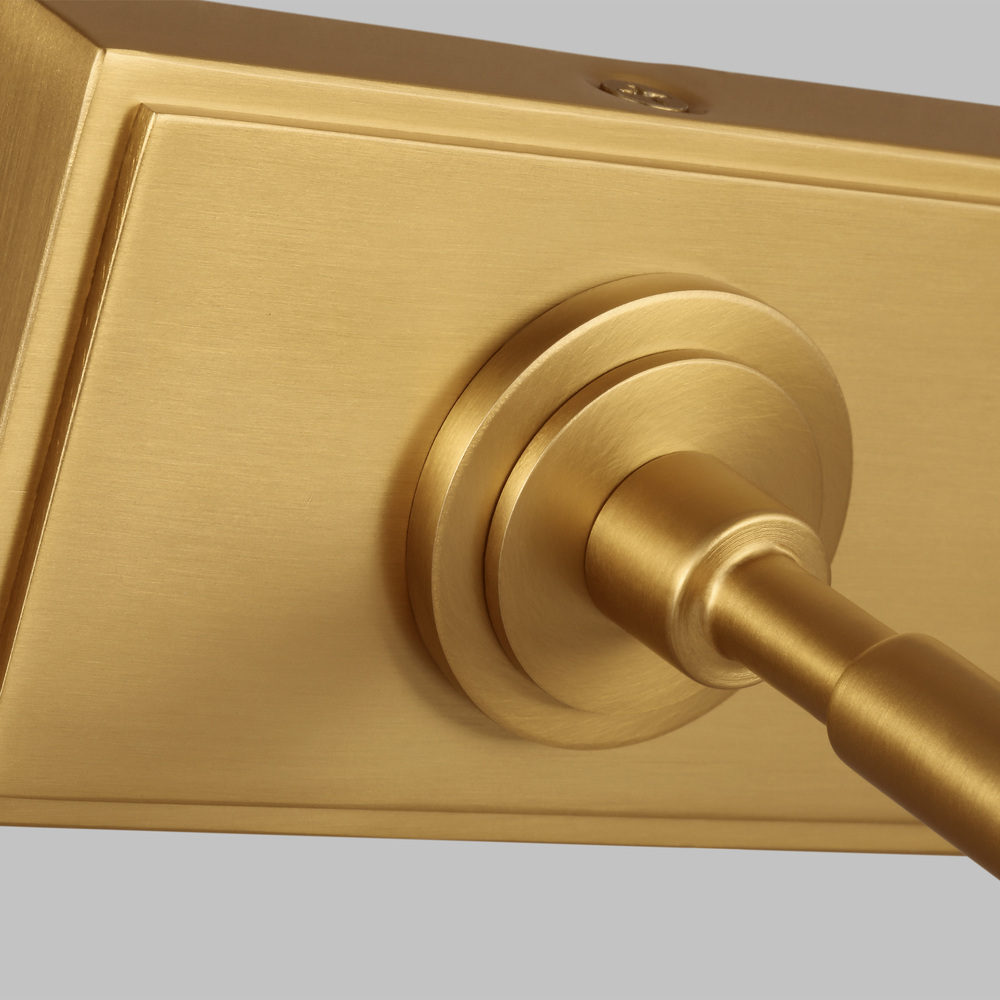 The Kenyon 18" Picture Light by Chapman & Myers were designed to be highly versatile in their application, at home in any interior. They have classic half round pharmacy shades which are mounted to a cylindrical metal stem with a differentiated stepped detailing. The picture lights have an architecturally inspired medallions where the arms mount to the rectangular backplate. Kenyon has a smooth clean metal shade that will bring the perfect light to your works of art. Available finishes include Aged Iron and Burnished Brass.