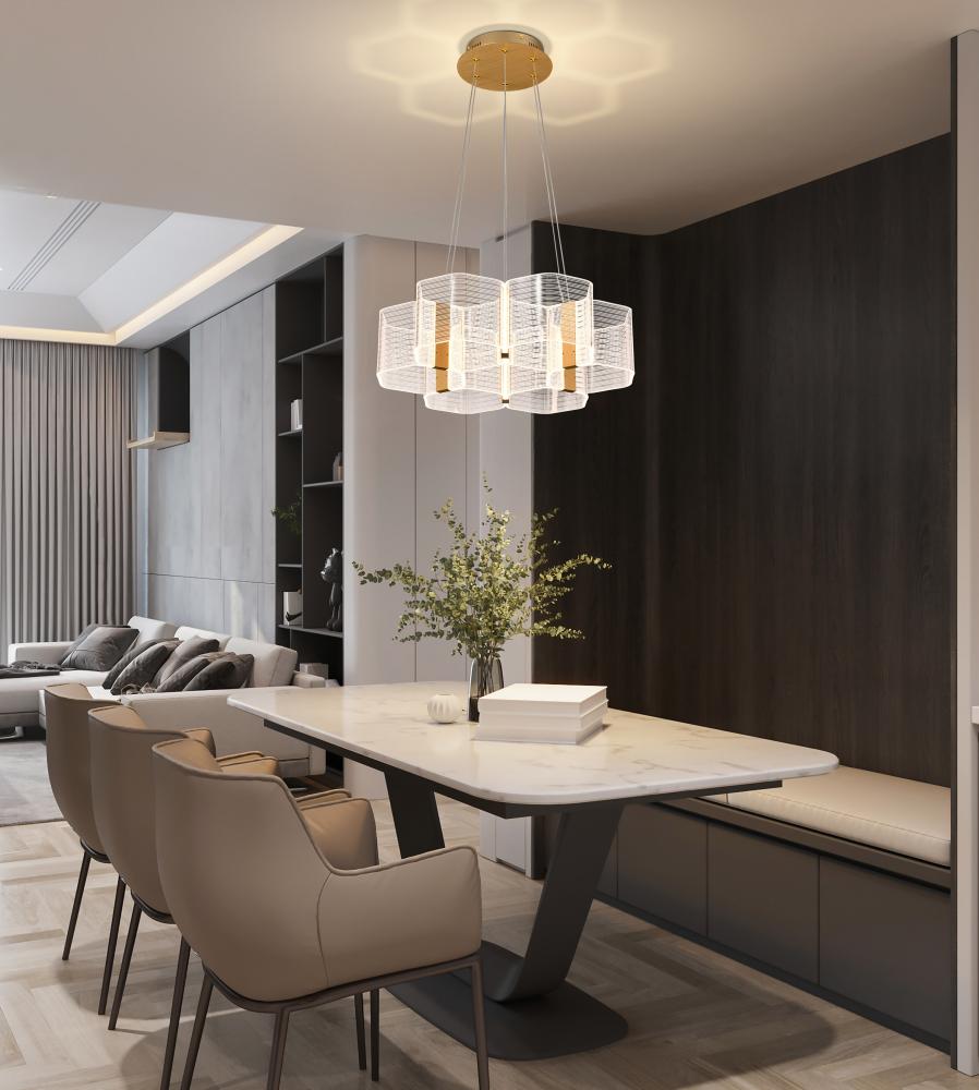 Unveil the art of Modern design with the Kenzo Collection, where bold geometric styling meets sculptural elegance. The parallel lines create a dynamic visual effect, blending symmetry with artistry for a look that captivates. Edge-lit acrylic shades provid
