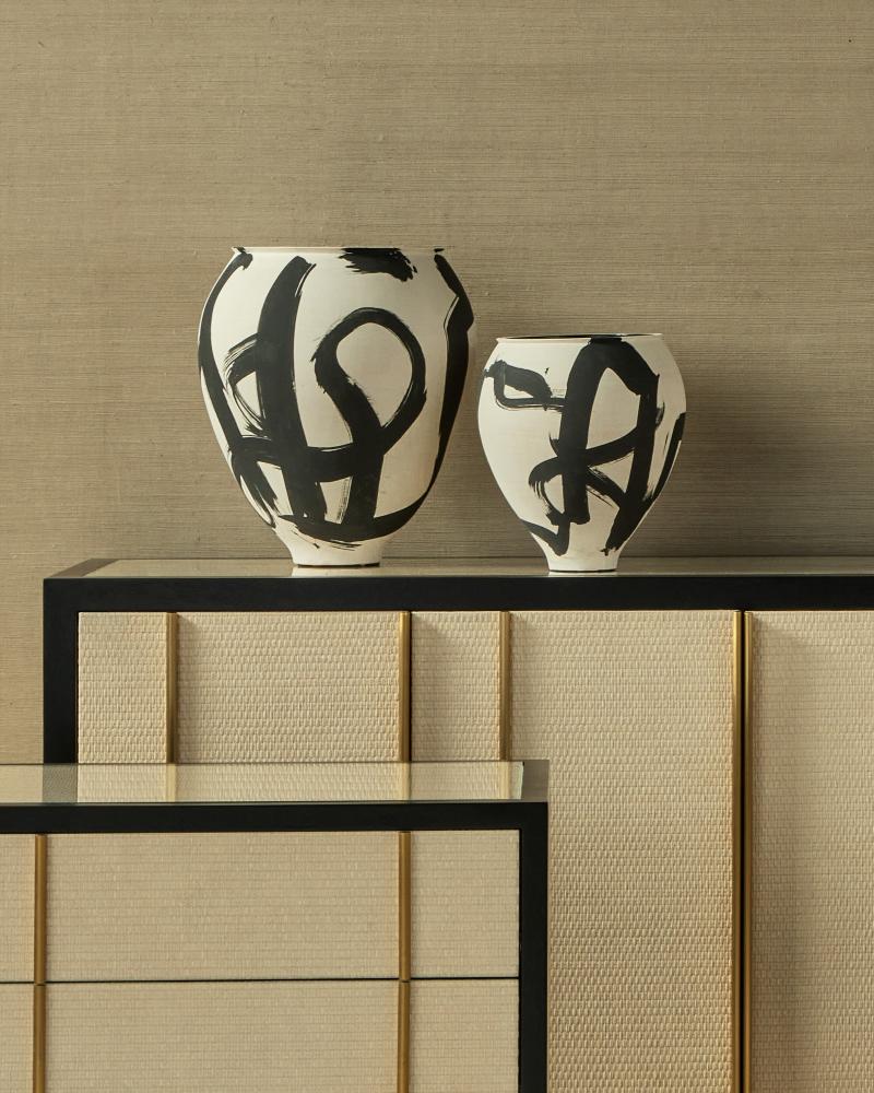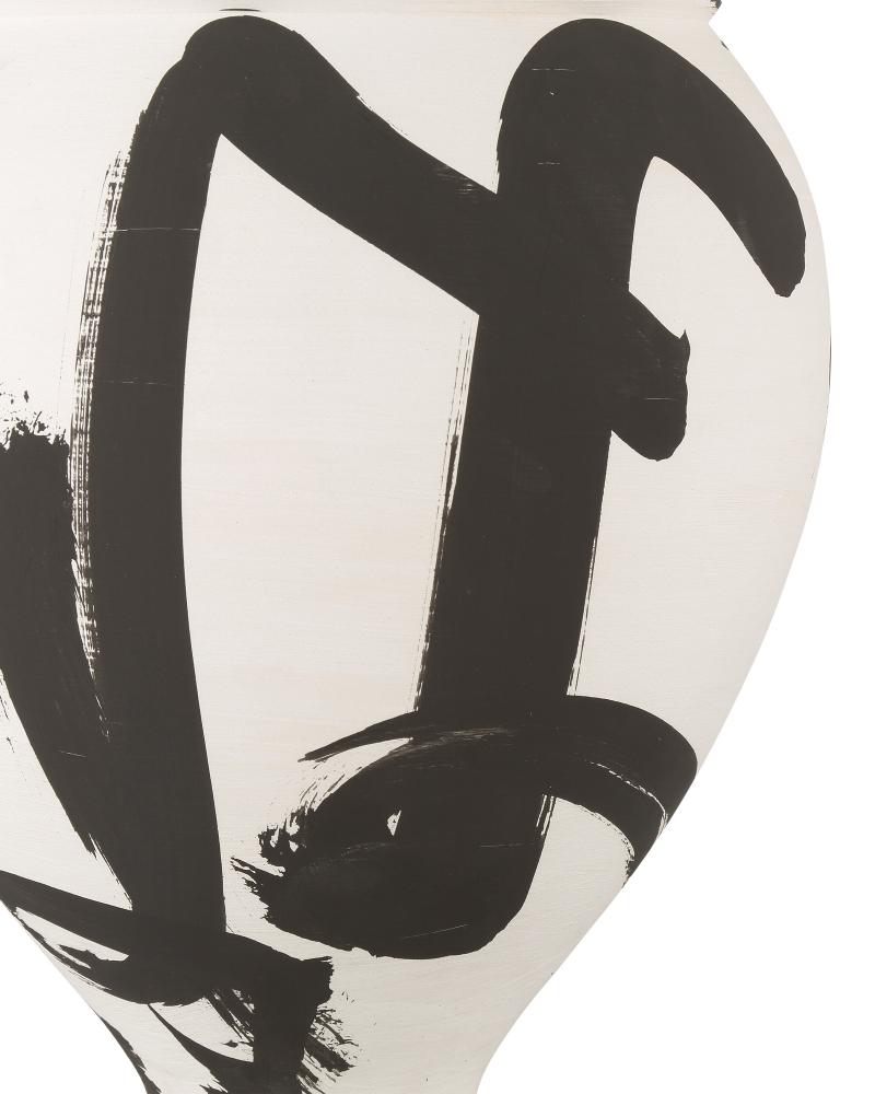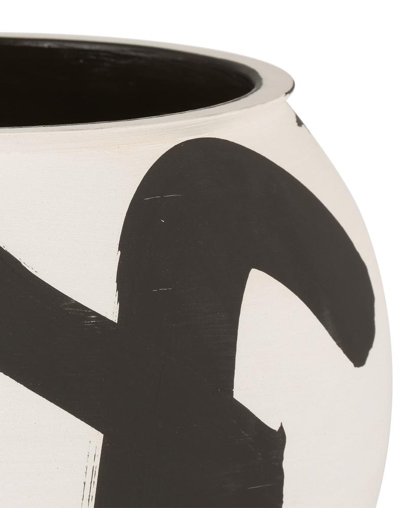 The sketched pattern on the surface of the Kenzo Medium Vase was inspired by the art of Imperial Japan, particularly the Enso, a prolific symbol in the Zen practice of painting. Made of porcelain, the black and off-white vessel is finished on the inside; and it is hand-thrown, hand-glazed, and hand-decorated so the patterns on each vase will vary slightly.