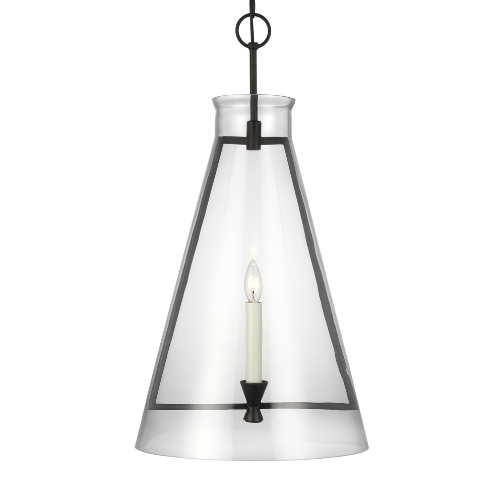 The Keystone one light indoor pendant casts a warm and inviting glow with its candelabra, set within an angular, Aged Iron frame and quarter inch thick clear glass. This series of chandeliers, sconces and pendants designed by Chapman & Myers for Visual Comfort Studio features very detailed construction including bobeches supporting each candle tube. The candle cup is based on a totem shape candle created by Alberto Giacometti and the frame is a re-interpretation of a one of Diego Giacometti’s hanging sculptures.