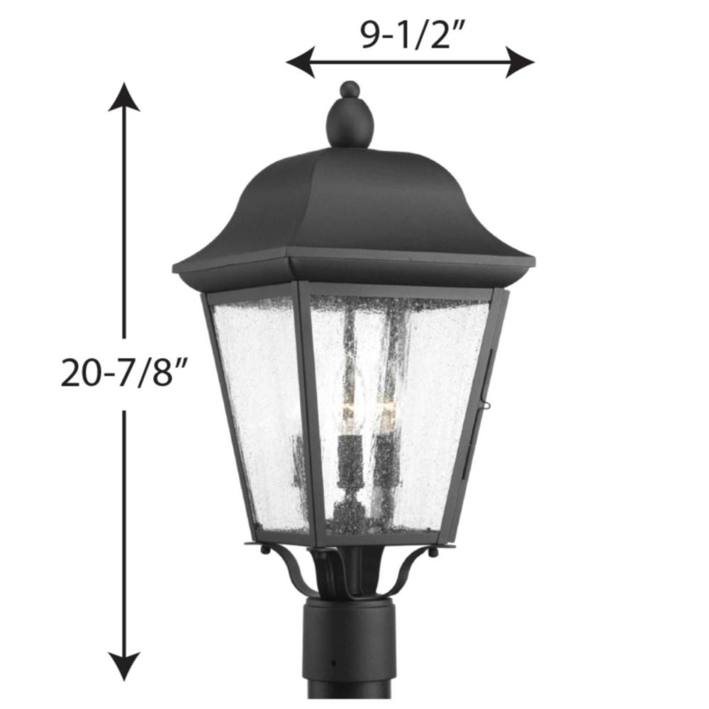 Black finish.;Updated classic style.;Seeded glass panels with traditional detailing.;Easy access for relamping.;Fits 3" post (order separately).