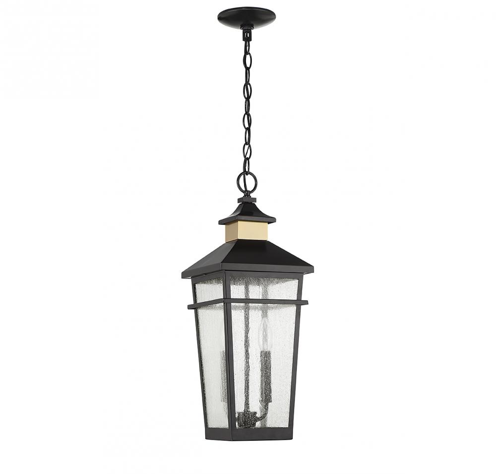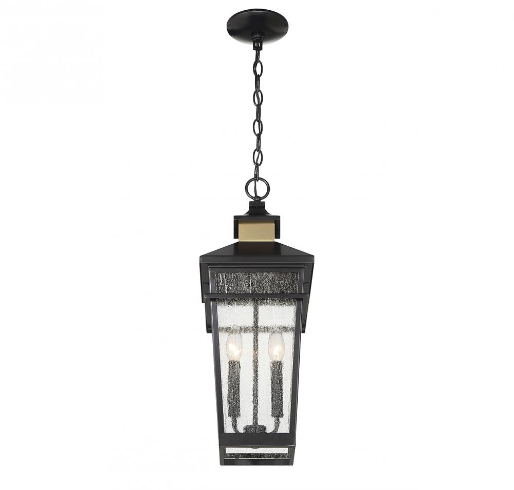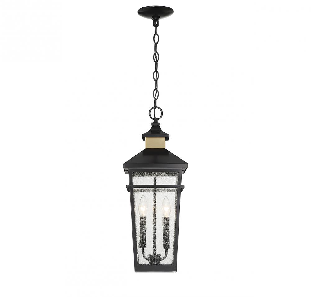 This Savoy House Kingsley 2-light outdoor hanging light has a coastal-inspired lantern style with highly fashionable touches. Panes of seedy glass are accentuated by a matte black finish with brass detailing at the hood. Kingsley is 22.5" in height and 8.5" in width. It uses 2 candelabra size bulbs of up to 40 watts per bulb (bulbs not included).