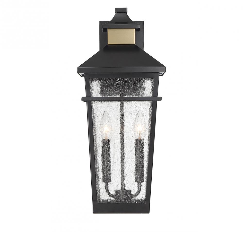 This Savoy House Kingsley 2-light outdoor wall light has a coastal-inspired lantern style with highly fashionable touches. Panes of seedy glass are accentuated by a matte black finish with brass detailing at the backplate and hood. Kingsley is 20.25" in height, 8.5" in width and extends 9.75" from the wall. It uses 2 candelabra size bulbs of up to 40 watts per bulb (bulbs not included).