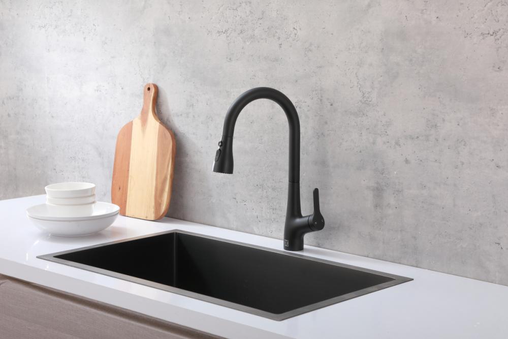 Discover the pinnacle of kitchen convenience with our single-handle lever faucet, granting seamless water control for all culinary needs. Crafted from durable brass with corrosion-resistant properties, this fixture endures even the busiest kitchens, maintaining both beauty and functionality. Embrace flexibility and reach with the retractable pull-down hose, simplifying tasks like rinsing, cleaning, and filling kitchen items with ease. Certified by UPC and IAPMO for safety and quality, rest assured of its reliability. Effortlessly switch between soft spray and aerated rinse modes for versatile use. With a maximum flow rate of 1.8 gallons per minute, it delivers powerful yet water-efficient performance, aiding in cost savings without compromising capability. The gooseneck design adds an elegant touch while offering practicality for washing large pots and dishes effortlessly. Equipped with a high-quality ceramic cartridge, expect enduring, drip-free operation, making daily chores a breeze.