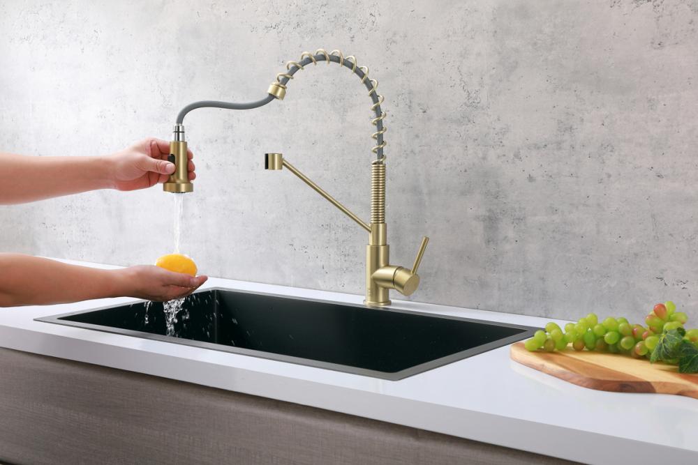 Showcasing a spring spout in an industrial style, accompanied by an ergonomic pull-down spray head.Our kitchen faucet simplifies water control with a single-handle lever, offering effortless precision for daily kitchen tasks. Crafted from robust brass, it's not just corrosion-resistant but built to endure, blending durability and style for an enhanced kitchen appearance. Equipped with a retractable pull-down hose, dish rinsing and sink cleaning become effortless, reaching every sink corner efficiently. Certified by UPC and IAPMO for safety and quality, it's a reliable addition. Featuring a button-switch spray head offering soft or powerful spray modes, and a maximum flow rate of 1.8 gallons per minute for strong yet water-conscious flow. Complete with 27.6" supply lines, installation is hassle-free, while the high-quality ceramic cartridge ensures enduring, drip-free operation.