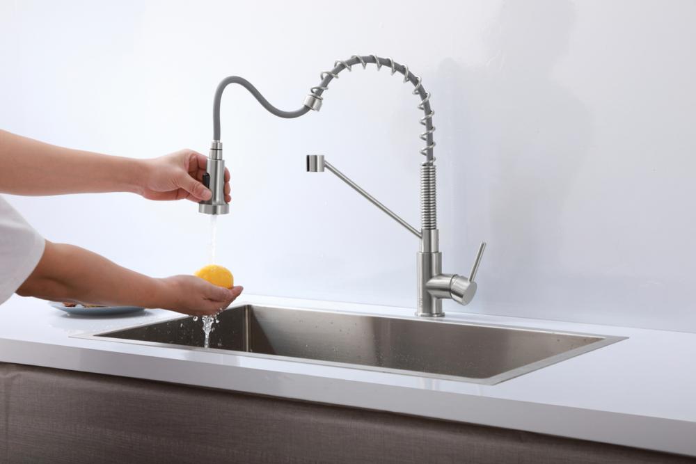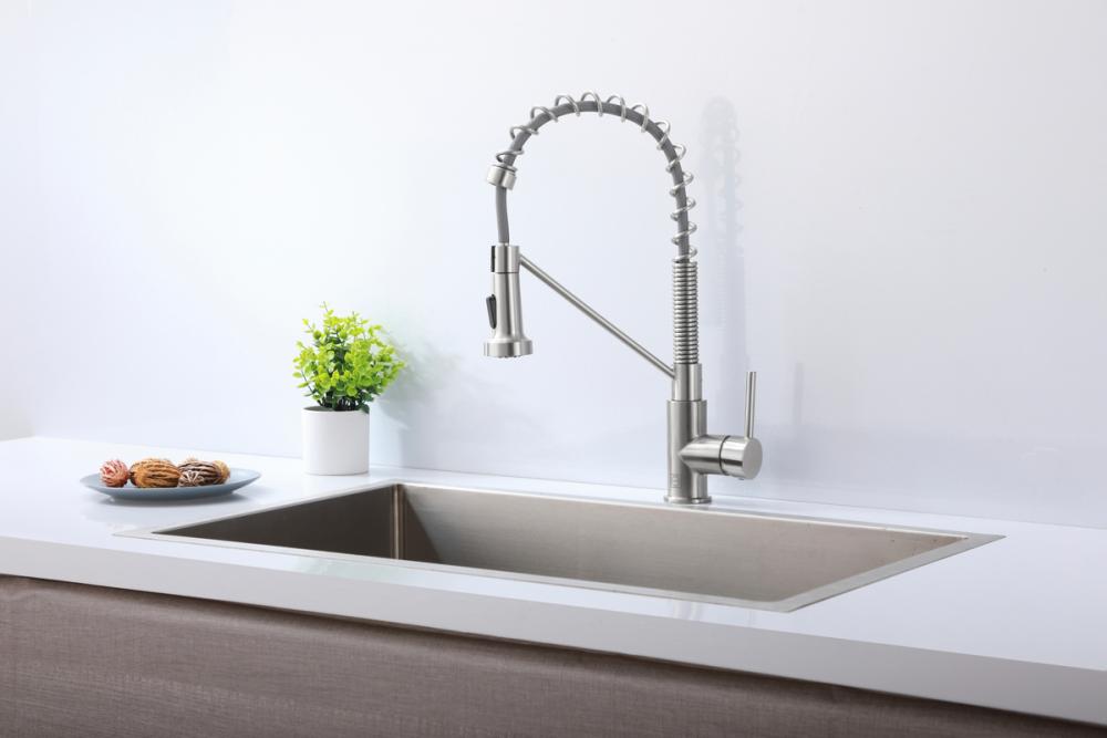 Showcasing a spring spout in an industrial style, accompanied by an ergonomic pull-down spray head.Our kitchen faucet simplifies water control with a single-handle lever, offering effortless precision for daily kitchen tasks. Crafted from robust brass, it's not just corrosion-resistant but built to endure, blending durability and style for an enhanced kitchen appearance. Equipped with a retractable pull-down hose, dish rinsing and sink cleaning become effortless, reaching every sink corner efficiently. Certified by UPC and IAPMO for safety and quality, it's a reliable addition. Featuring a button-switch spray head offering soft or powerful spray modes, and a maximum flow rate of 1.8 gallons per minute for strong yet water-conscious flow. Complete with 27.6" supply lines, installation is hassle-free, while the high-quality ceramic cartridge ensures enduring, drip-free operation.