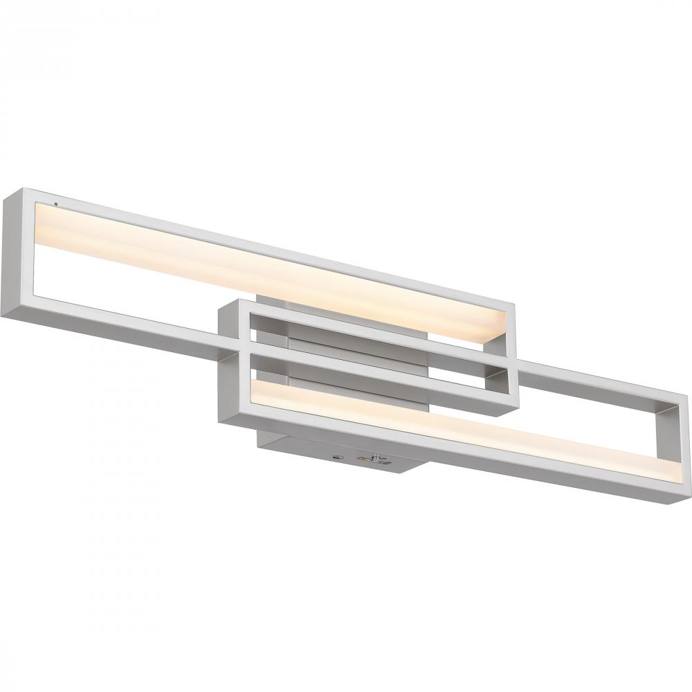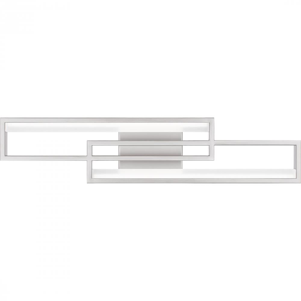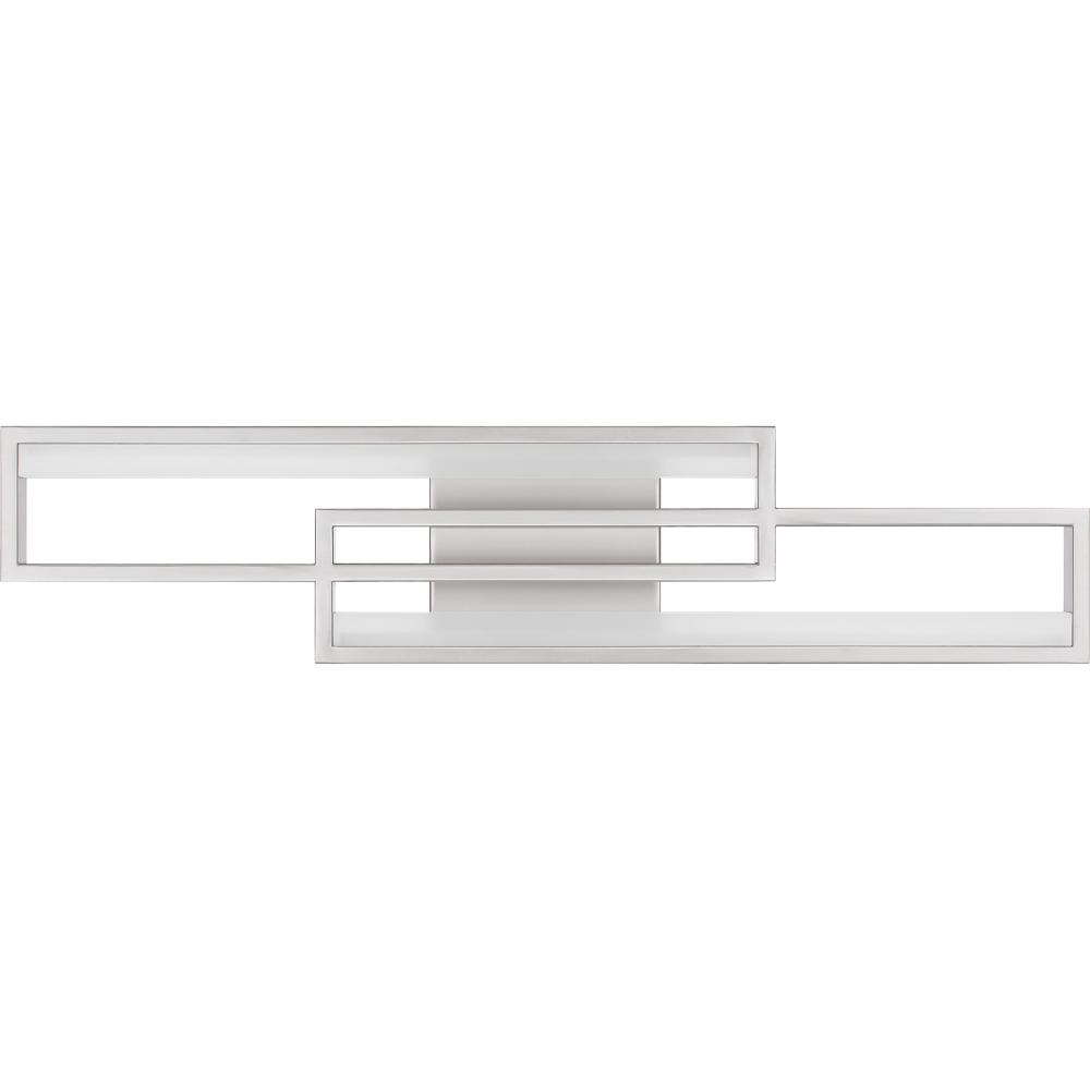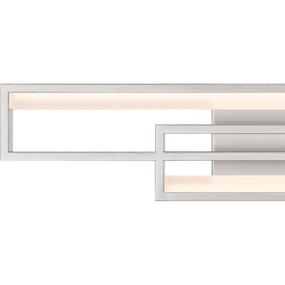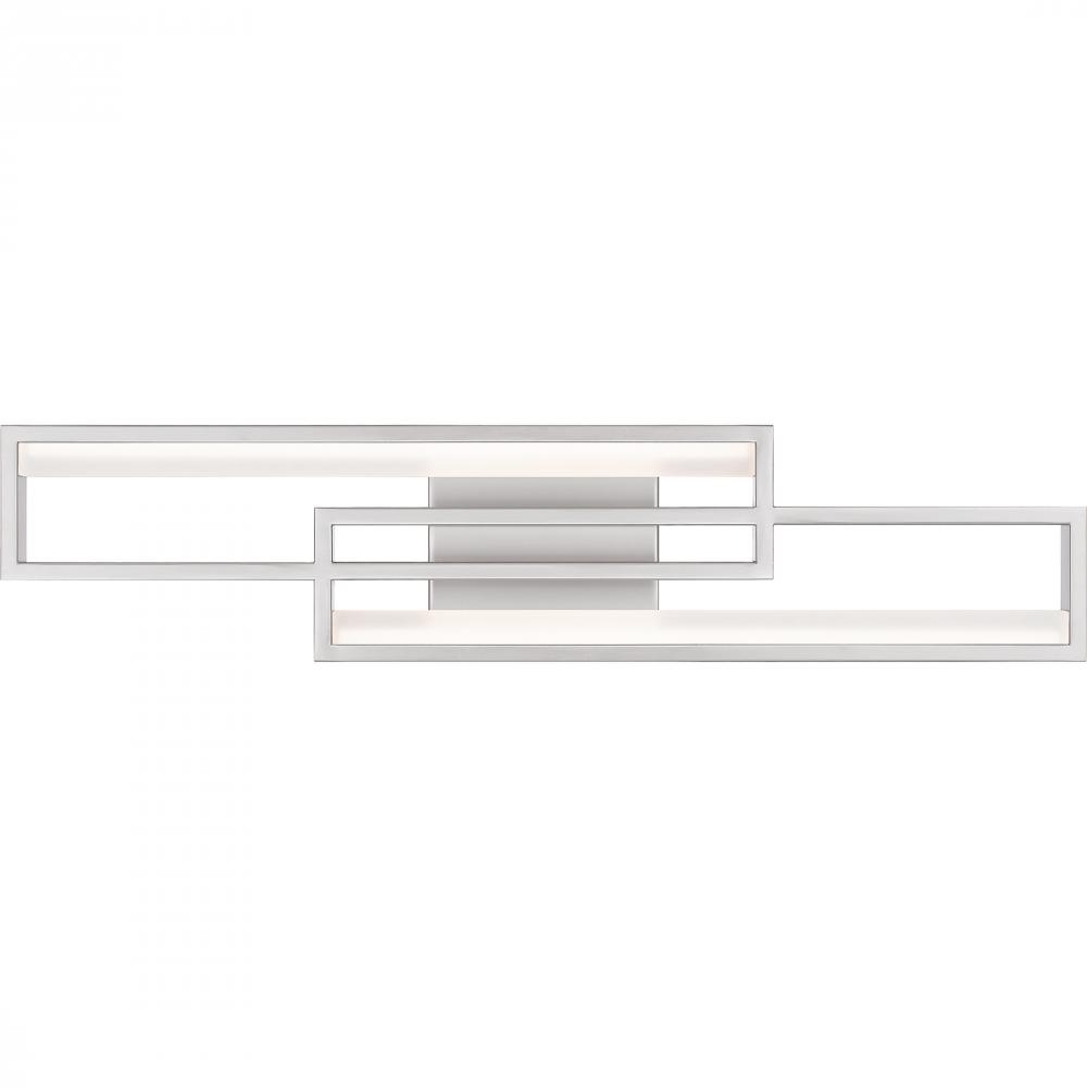 Kocha bath lights feature a bold, geometric design that makes a statement in any bathroom. An integrated LED light source shines brilliantly through the sculptural shapes for a cool, ambient glow. Part of the popular Platinum by Quoizel collection, Kocha p