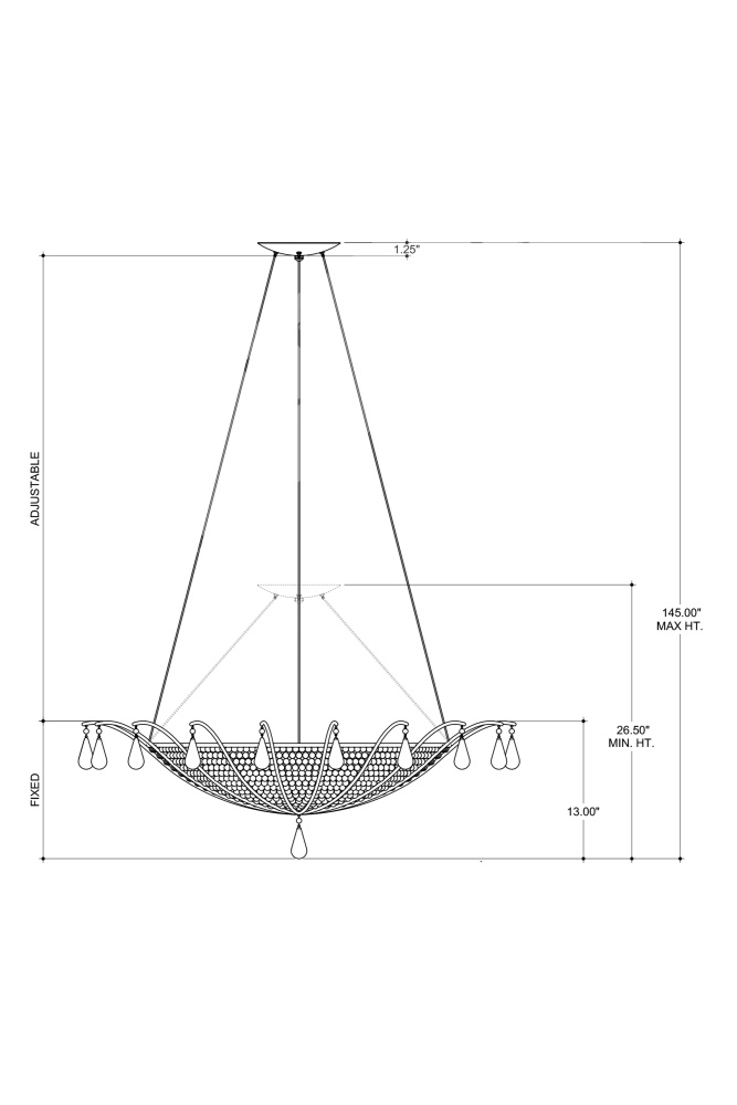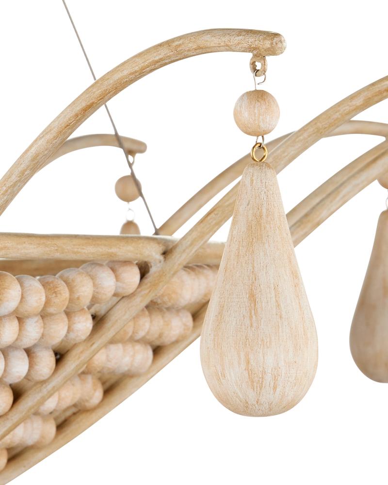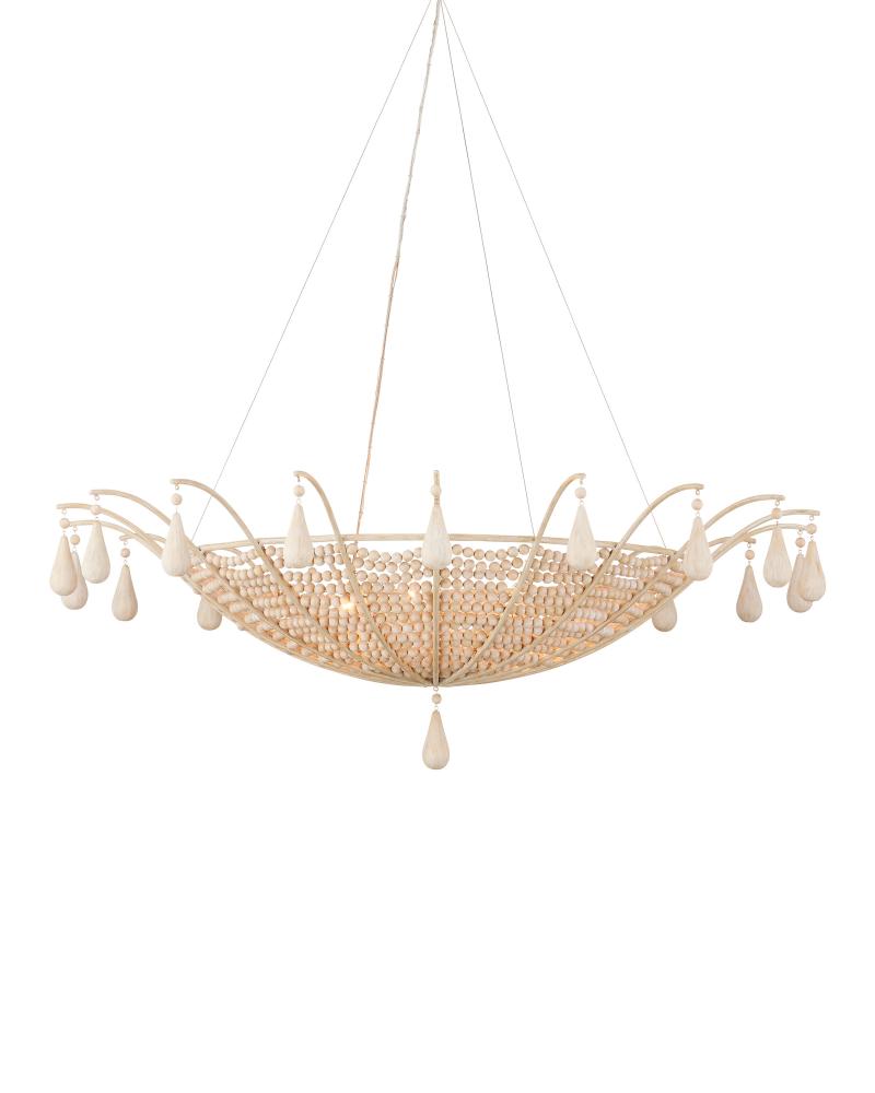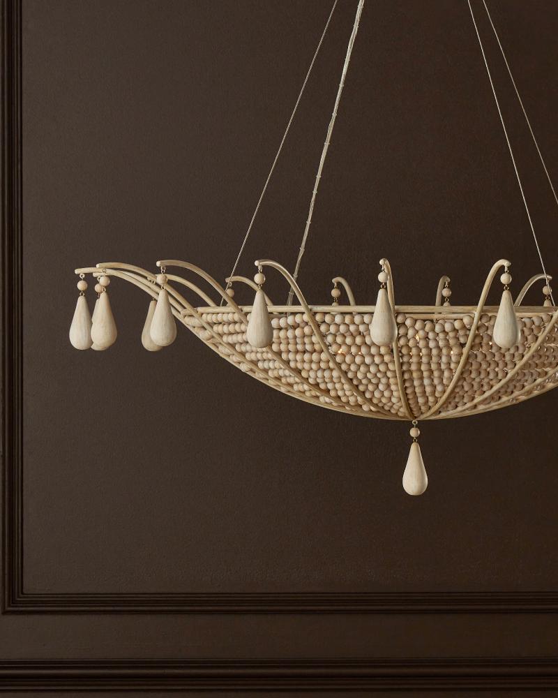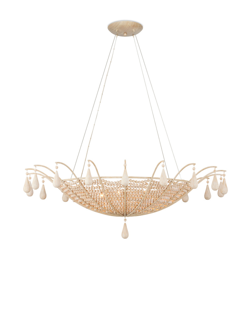 The Korg Chandelier in the Barry Goralnick Collection was inspired by a Swedish basket the designer discovered while antiquing during his travels abroad. He loved the shape of the basket and the teardrops, and the craftsmanship was superb. Goralnick thought this was the perfect form to be interpreted into the materials chosen — the wooden beads and pendants strung along a wrought iron frame, all covered in a Sandstone finish. The graceful beige chandelier exudes an earthy glamour that makes it the perfect fit for rooms with a coastal, tropical, or international aesthetic. Adjustable from 26.5" to 145" with use of included chain/rod kit/cable. If your space calls for a longer drop, additional chain/rods/cable is available for purchase.
