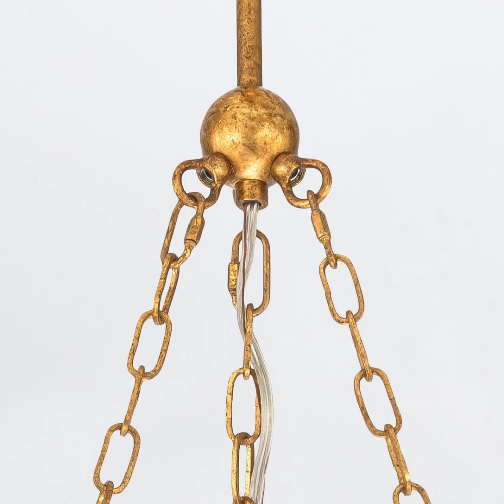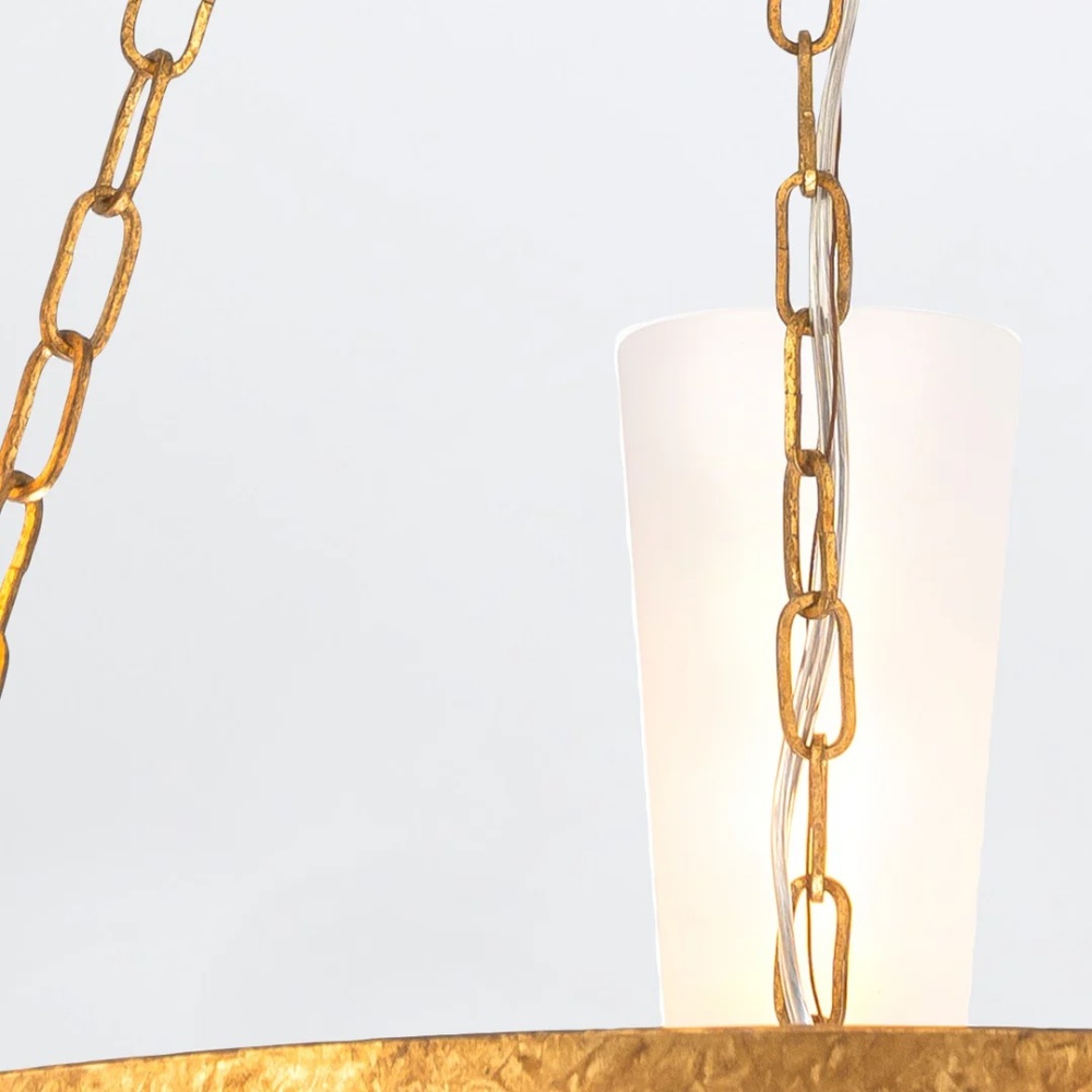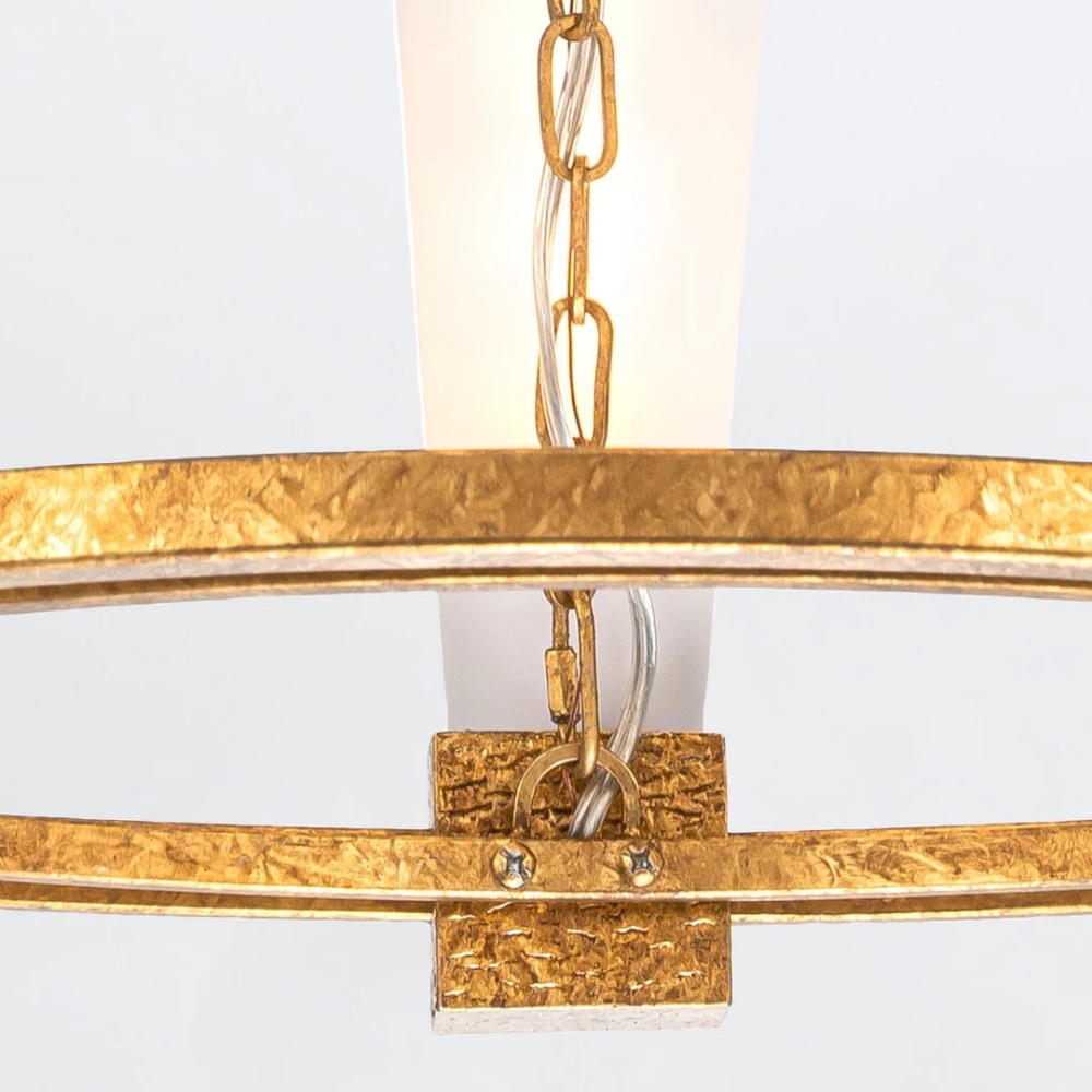 The 26" wide Kristy 3-Light Chandelier in antiqued gold with adjustable height via gold piping offers a textured frame and opal white glass. Its memorable style enhances any space with a warm glow.
