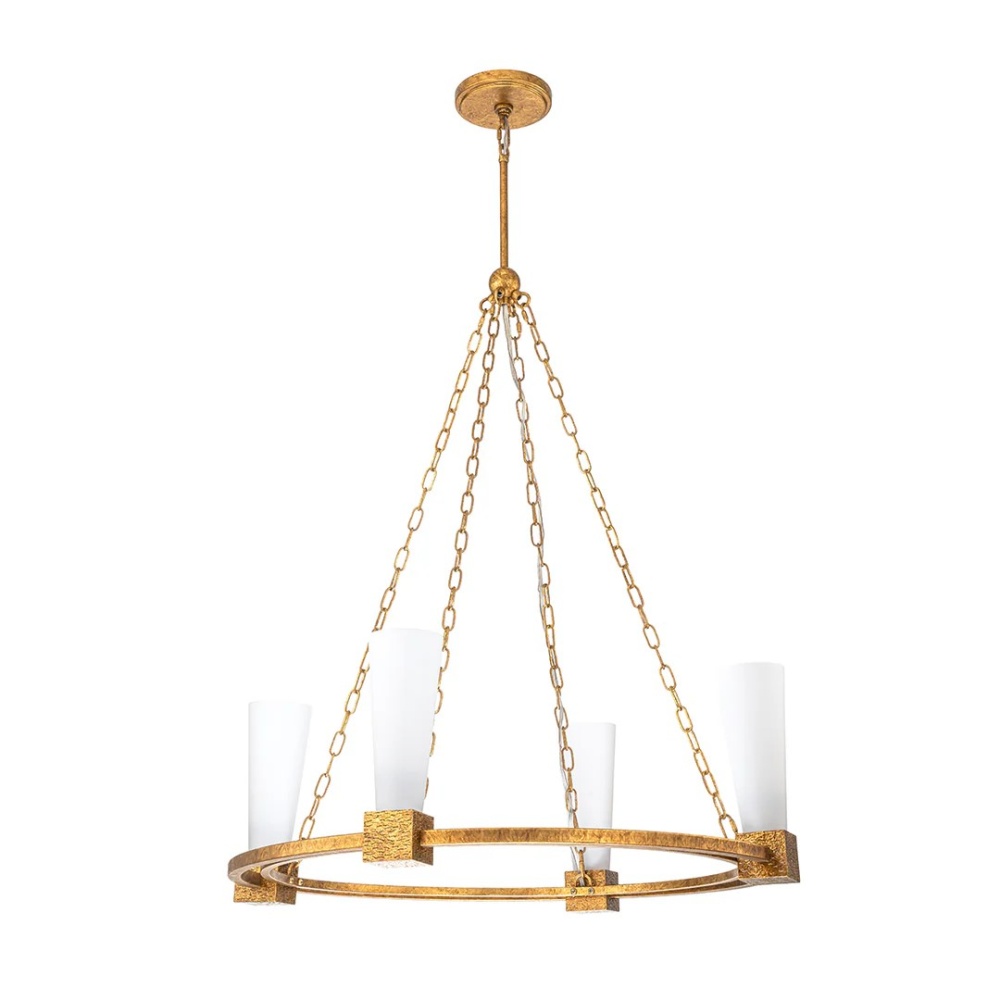 The 33" wide Kristy 4-Light Chandelier in antiqued gold with adjustable height via gold piping features a textured frame and opal white glass, adding unique luxury and glow to any setting.