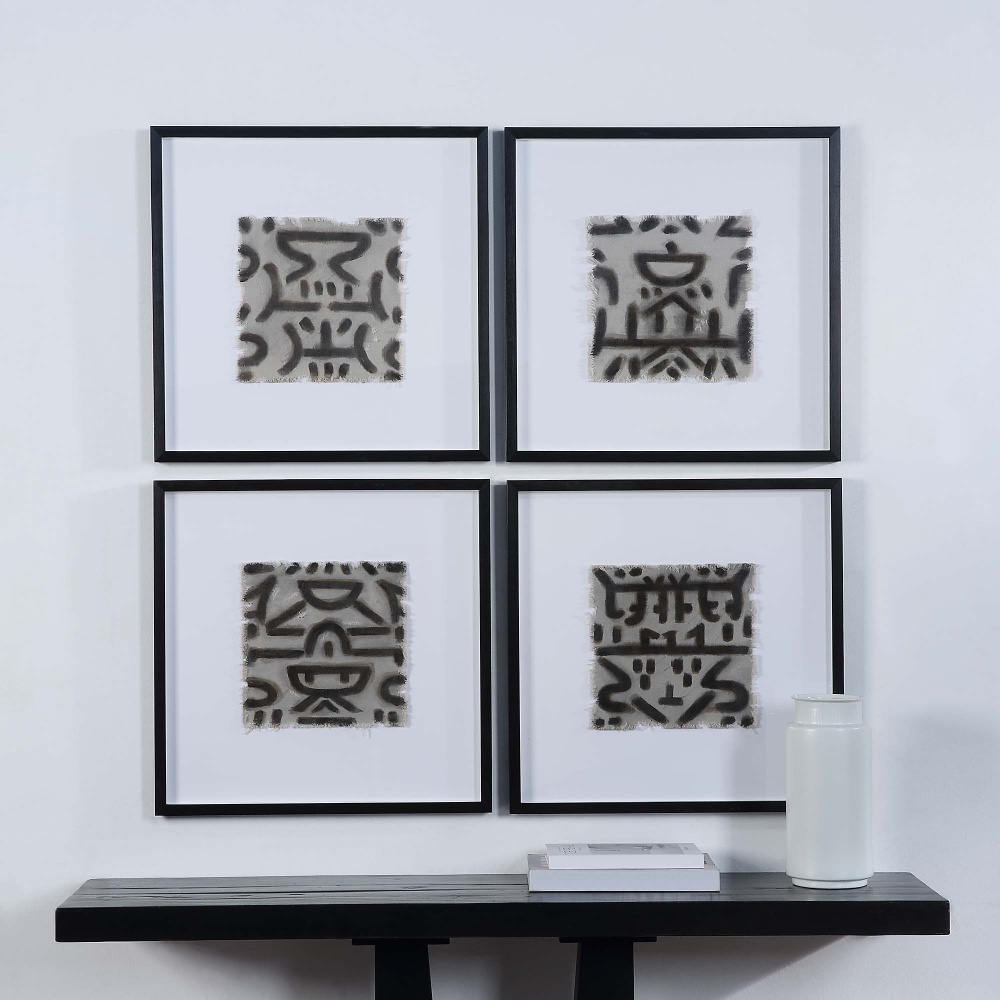 Archeological influences shine brightly from these four framed wall art designs. While each piece showcases a different arrangement, they all perfectly complement and contrast one another. Arranged amid wood and leather furnishings and details, the creative quality of these framed wall decor pieces is optimally enhanced.