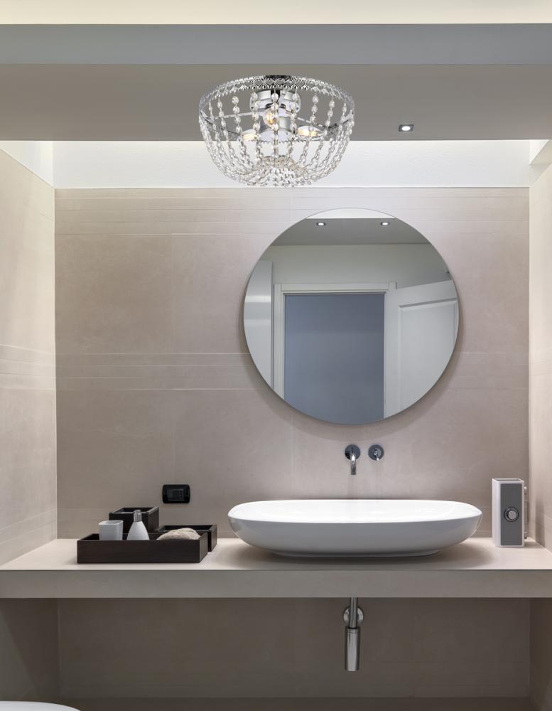 Tiers of clear multi-faceted crystals reflect the soft glow of candelabra bulbs