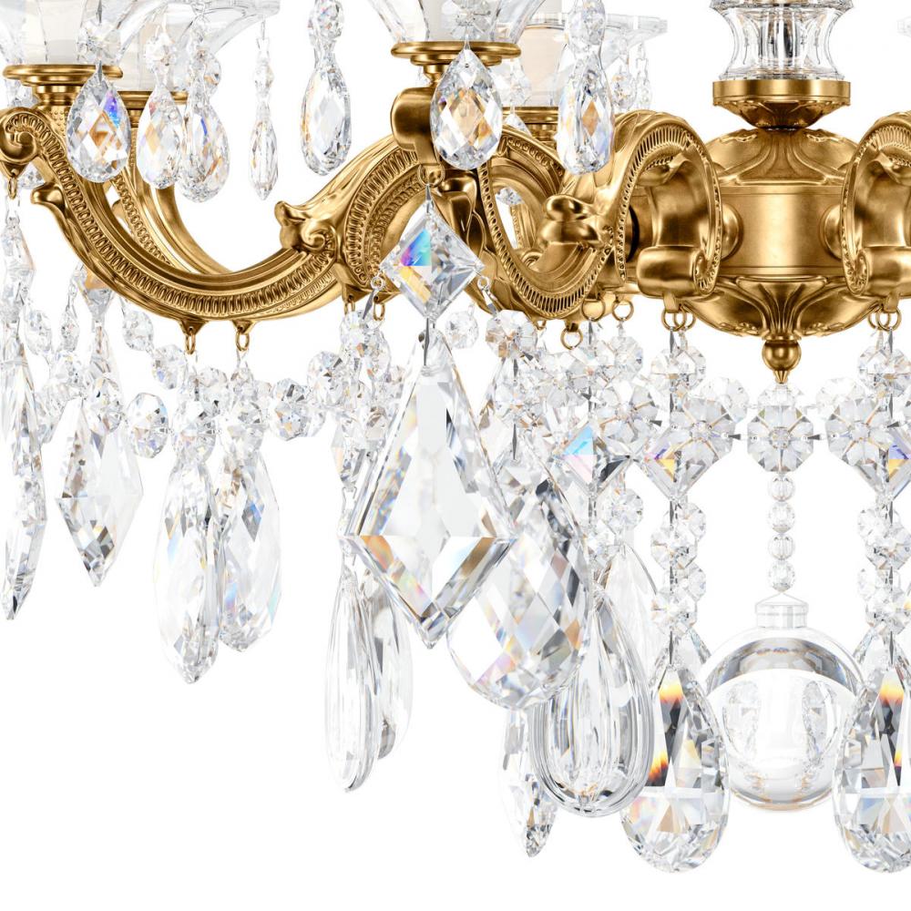 The soft curves, leaf-like motifs, rich crystal garlands and flower-shaped cups of La Scala evoke the sixteenth-century chandeliers of the Rococo. Its ornate arms and scrolls are cast by hand from Schonbek family molds.