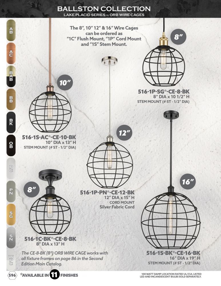 The Lake Placid pendants are versatile and showcase the popular orb wire cage design. With five sizes, multiple finish options, choice of bulb type, and stem or cord mount, you can make this fixture your own. The orb cage is timeless and an excellent cho