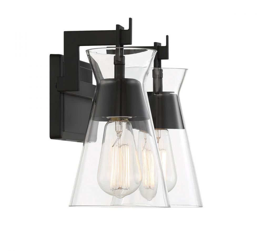 Conical shades of clear glass recall Italian midcentury modern lighting designs in the stylish Lakewood 2-light bath vanity light from Savoy House. The glass is suspended from angular reimaginings of shepherd's hooks and the fixture is finished in bold matte black. Lakewood is 9.5" in height, 16" in width and extends 6.5" from the wall. It uses two standard size bulbs with a max of 60 watts per bulb. Damp area rated.