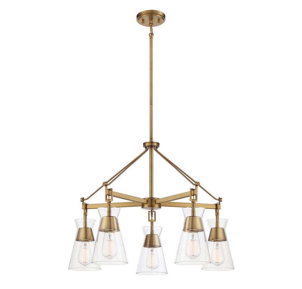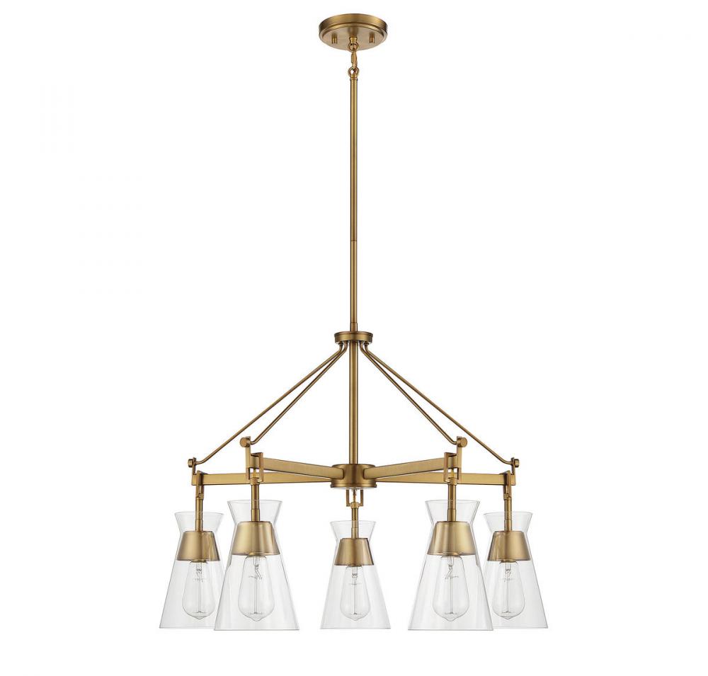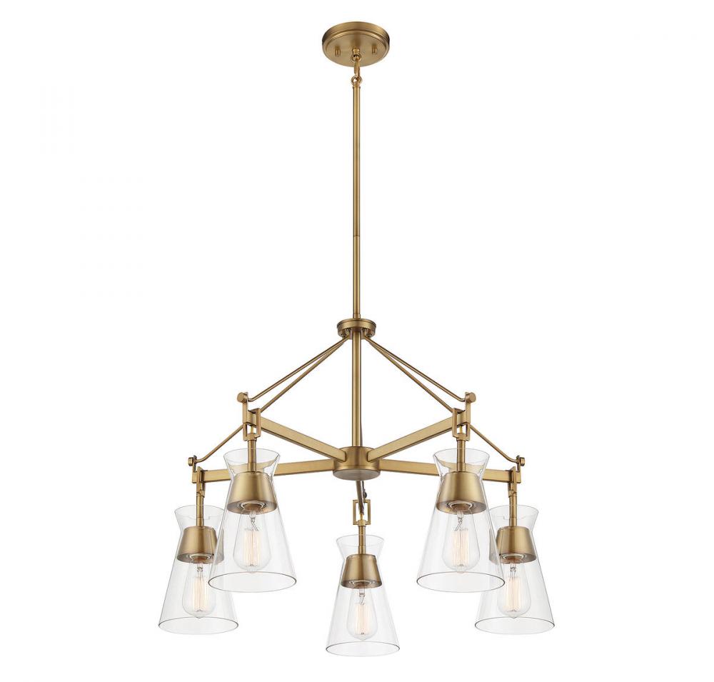 Conical shades of clear glass recall Italian midcentury modern lighting designs in the stylish Lakewood 5-light chandelier from Savoy House. The fixture is finished in rich warm brass. Lakewood is 28" in diameter and has an adjustable height ranging from 26" to 72". It uses five standard size bulbs with a max of 60 watts per bulb. Comes with four 12" downrods and one 6" downrod, plus 80" of cord.