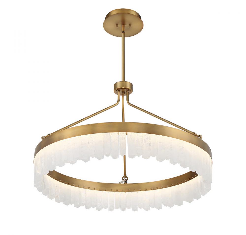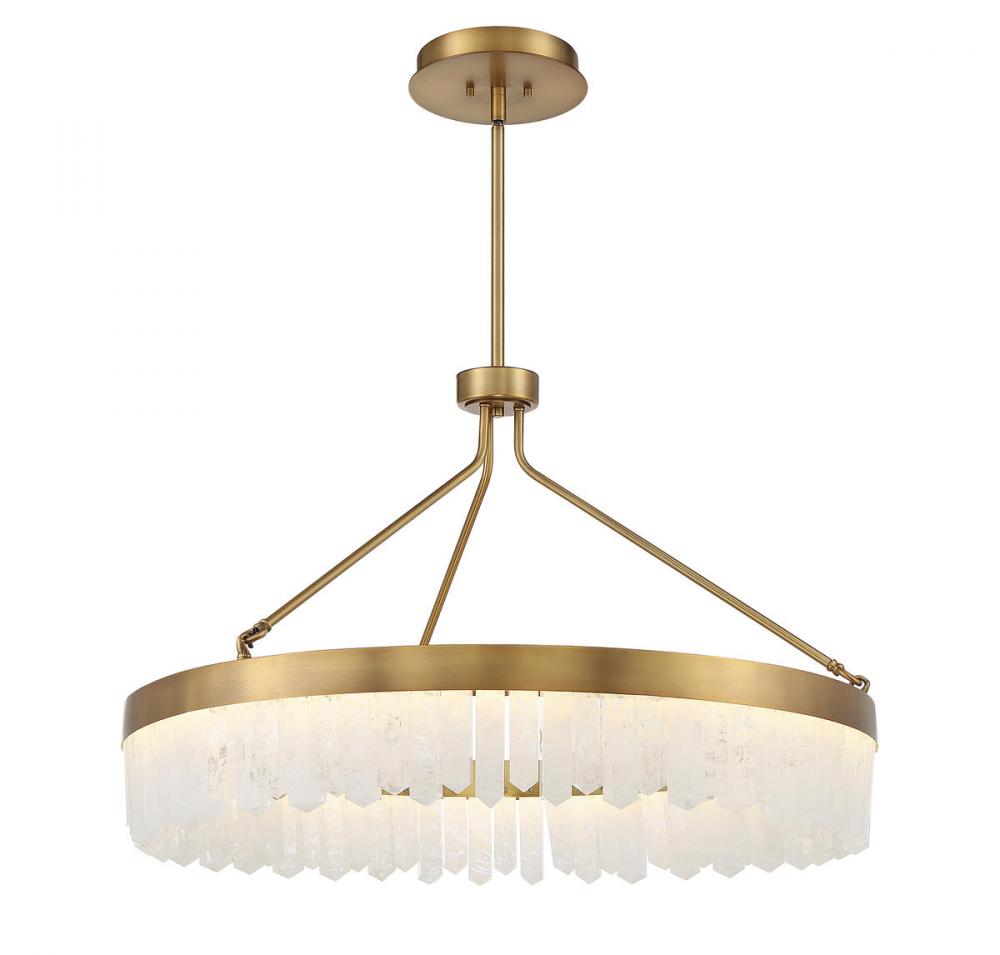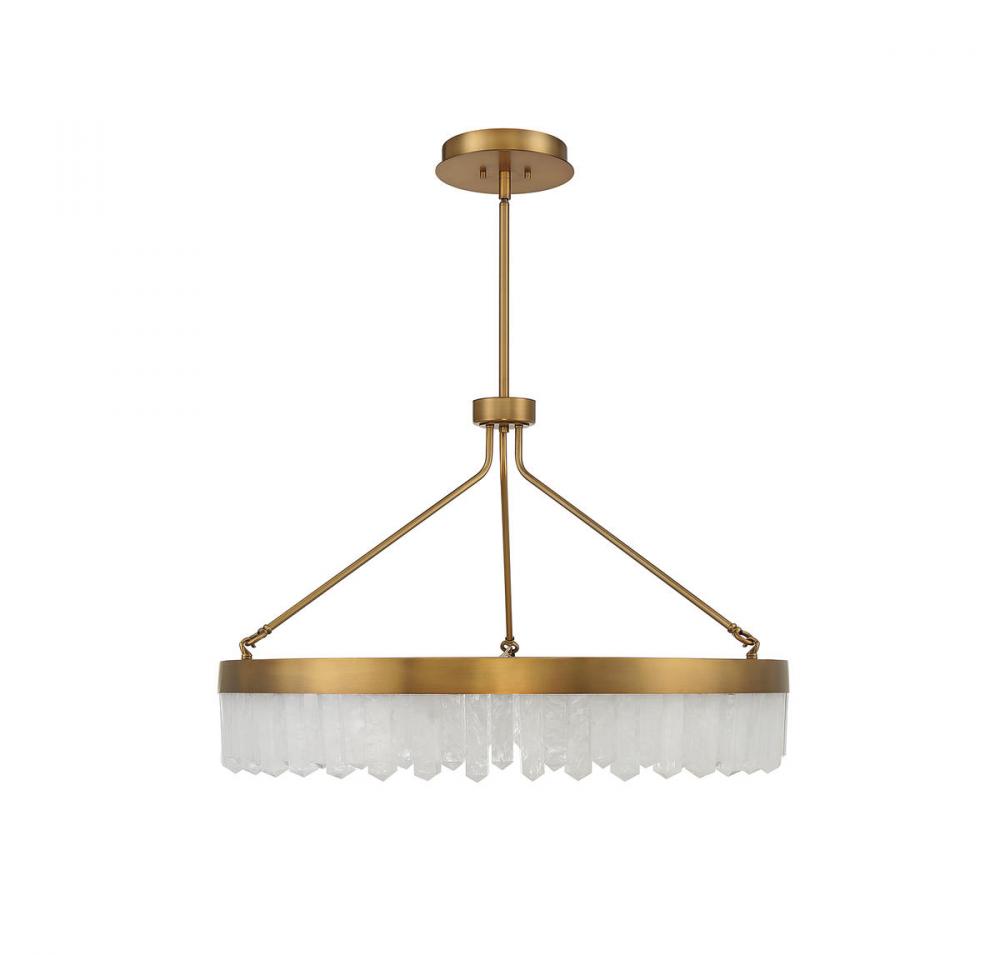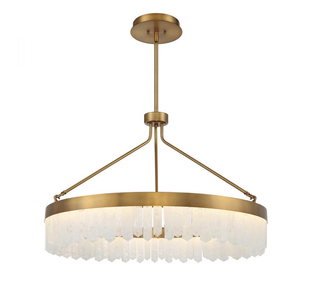 Create a breathtaking glow with the Savoy House Landon pendant, which features a circular shade adorned with dramatically-cut pieces of calcite that are illuminated from within by integrated LED light sources. The warm brass finish adds to the bright, warm look. Landon is 22" in height and 34" in width. It comes with four 12" downrods and one 6" downrod, plus 80" of cord.