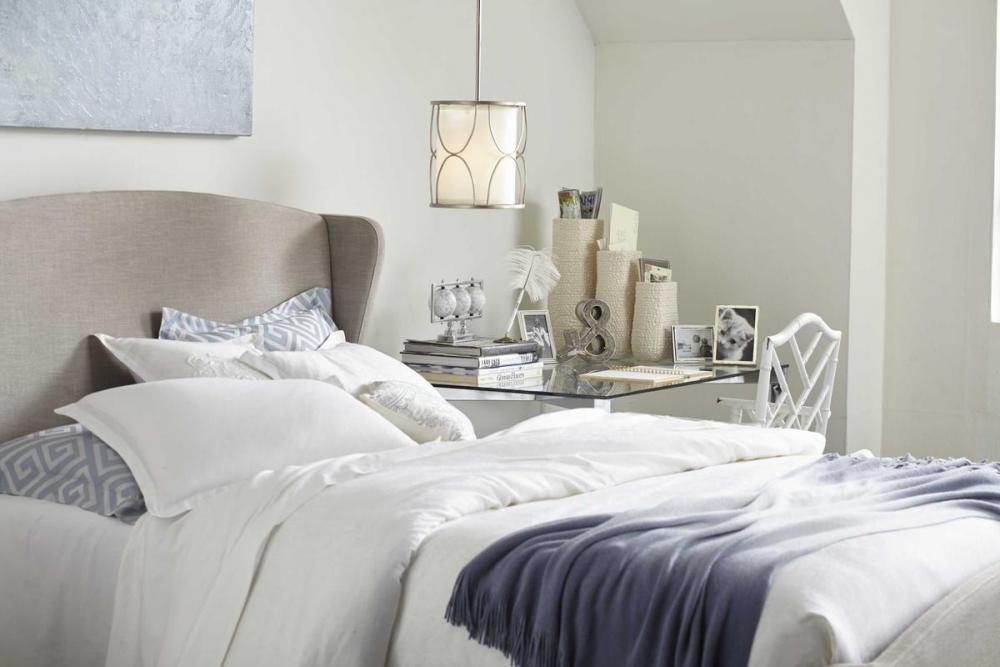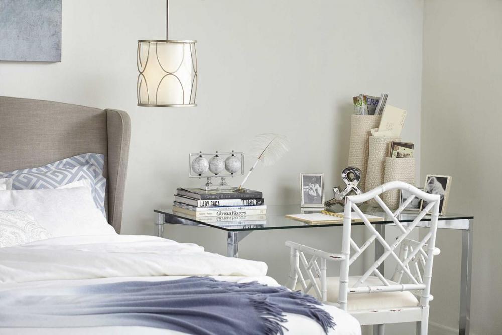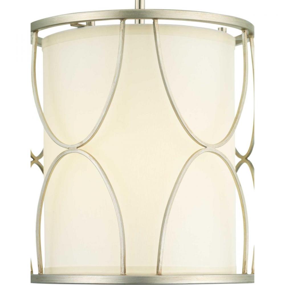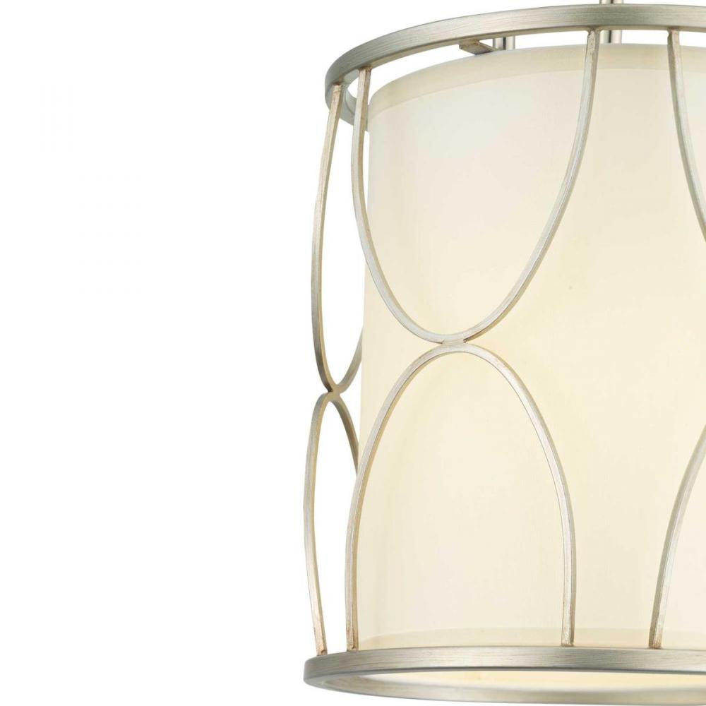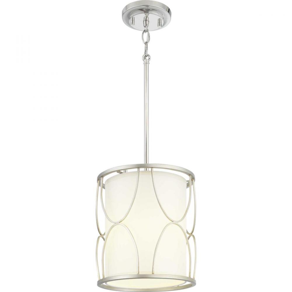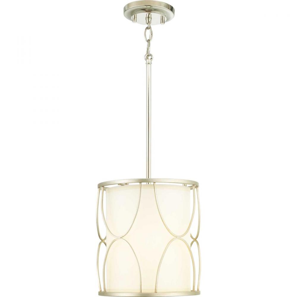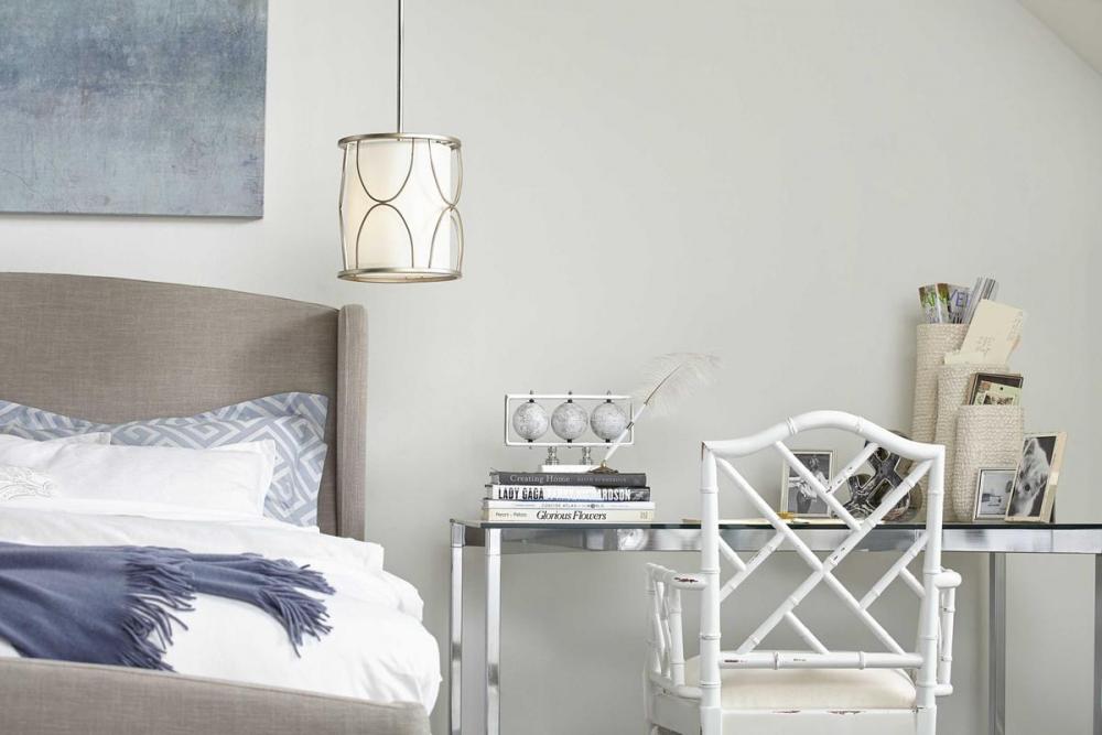 Exaggerated scale and elegant finishes define Landree’s collection of lighting fixtures;A white silk shade on the one-light mini-pendant highlights the metal frame;The pendants can substitute for lamps over bedside tables or hang in multiples over a kitc