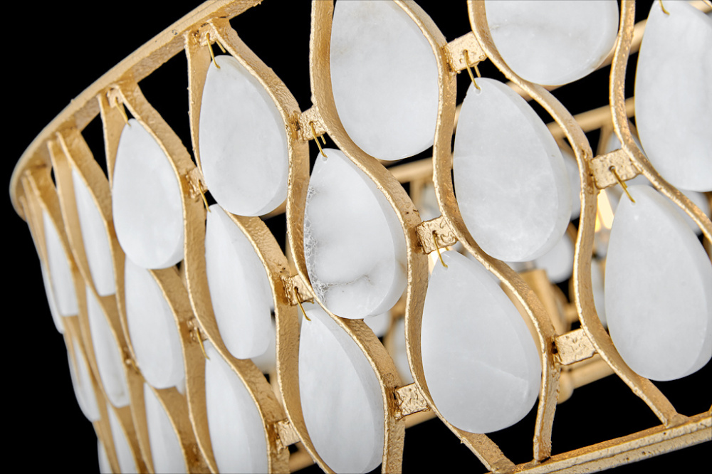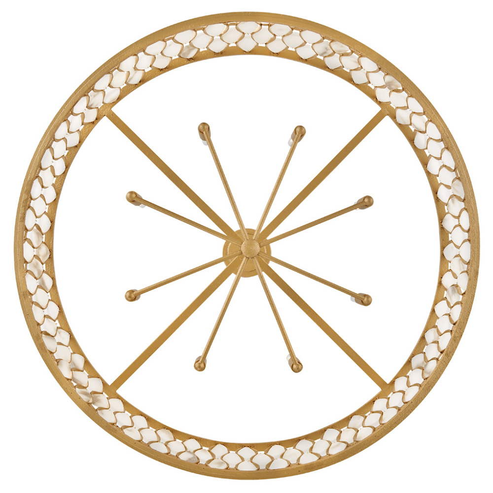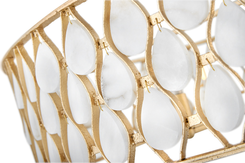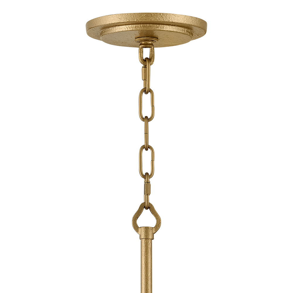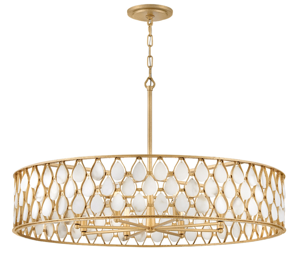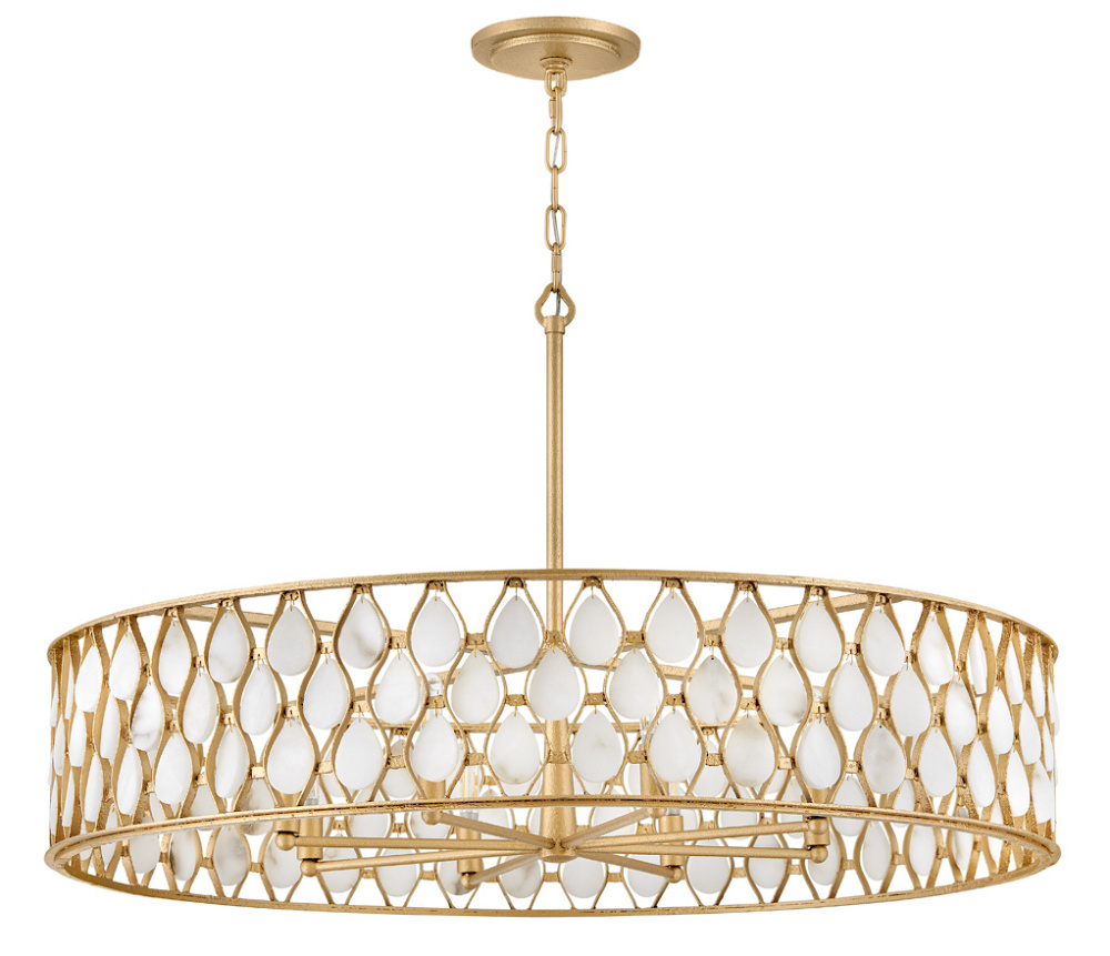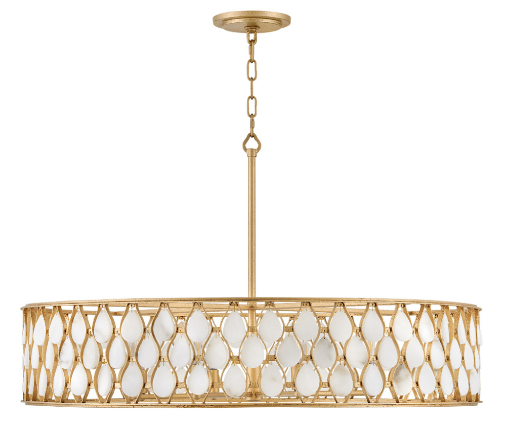 Opulently adorned with natural alabaster stones held within a traditional latticework shade, Estie brings organic elegance to any aesthetic. Intricately curved metalwork complements the frame, chain, and canopy in a textured Piastra Gold finish.