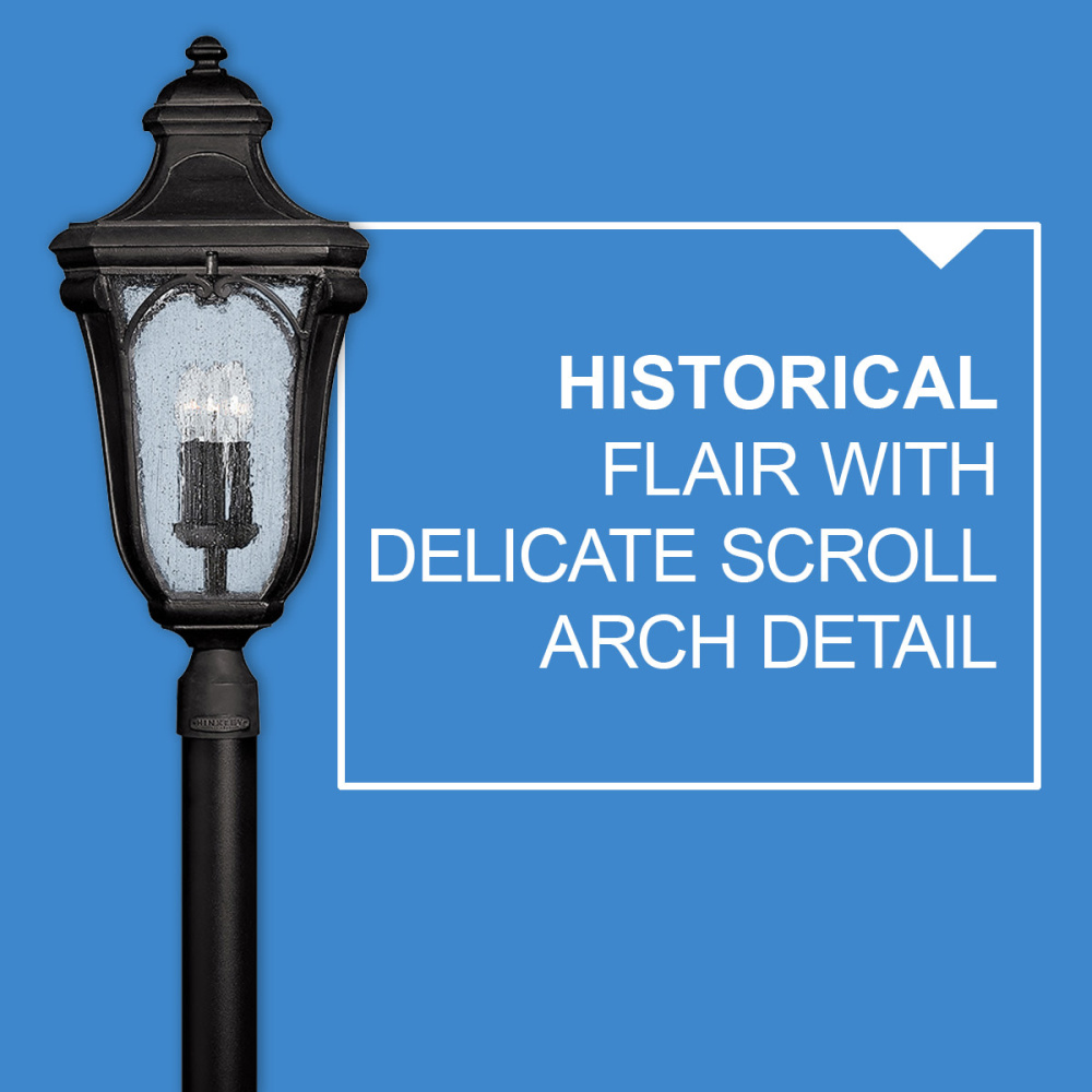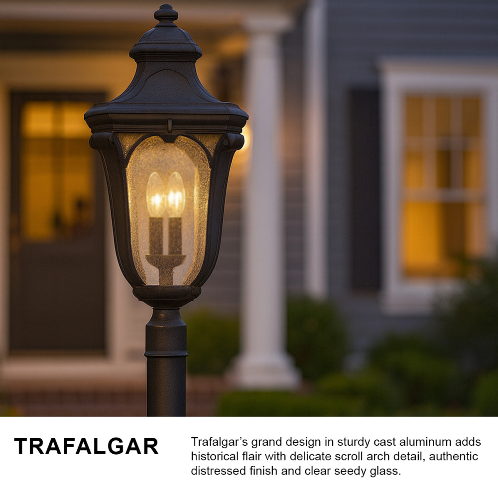 Trafalgar’s grand design in sturdy cast aluminum adds historical flair with delicate scroll arch detail, authentic distressed finish and clear seedy glass.