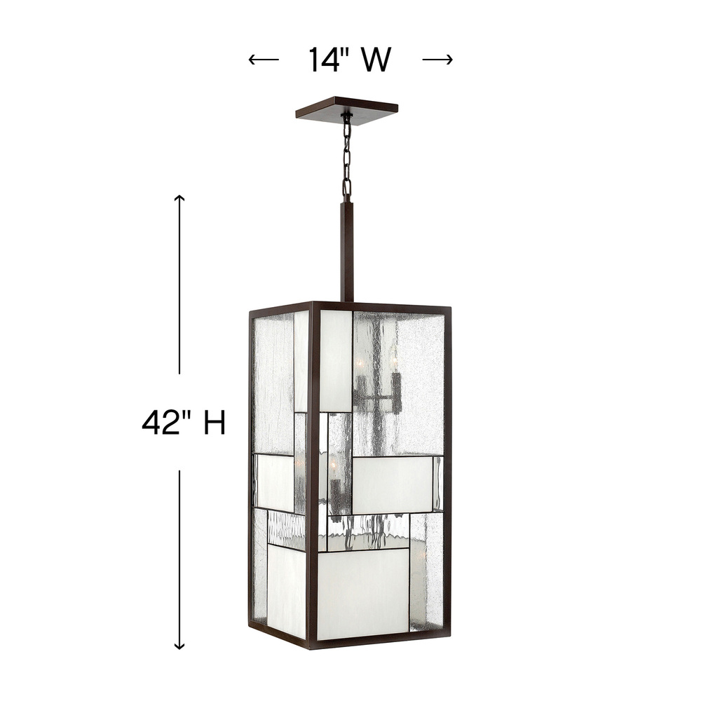 Mondrian’s unique patterned panels of glass mounted in copper foil add geometric panache in a Buckeye Bronze finish.