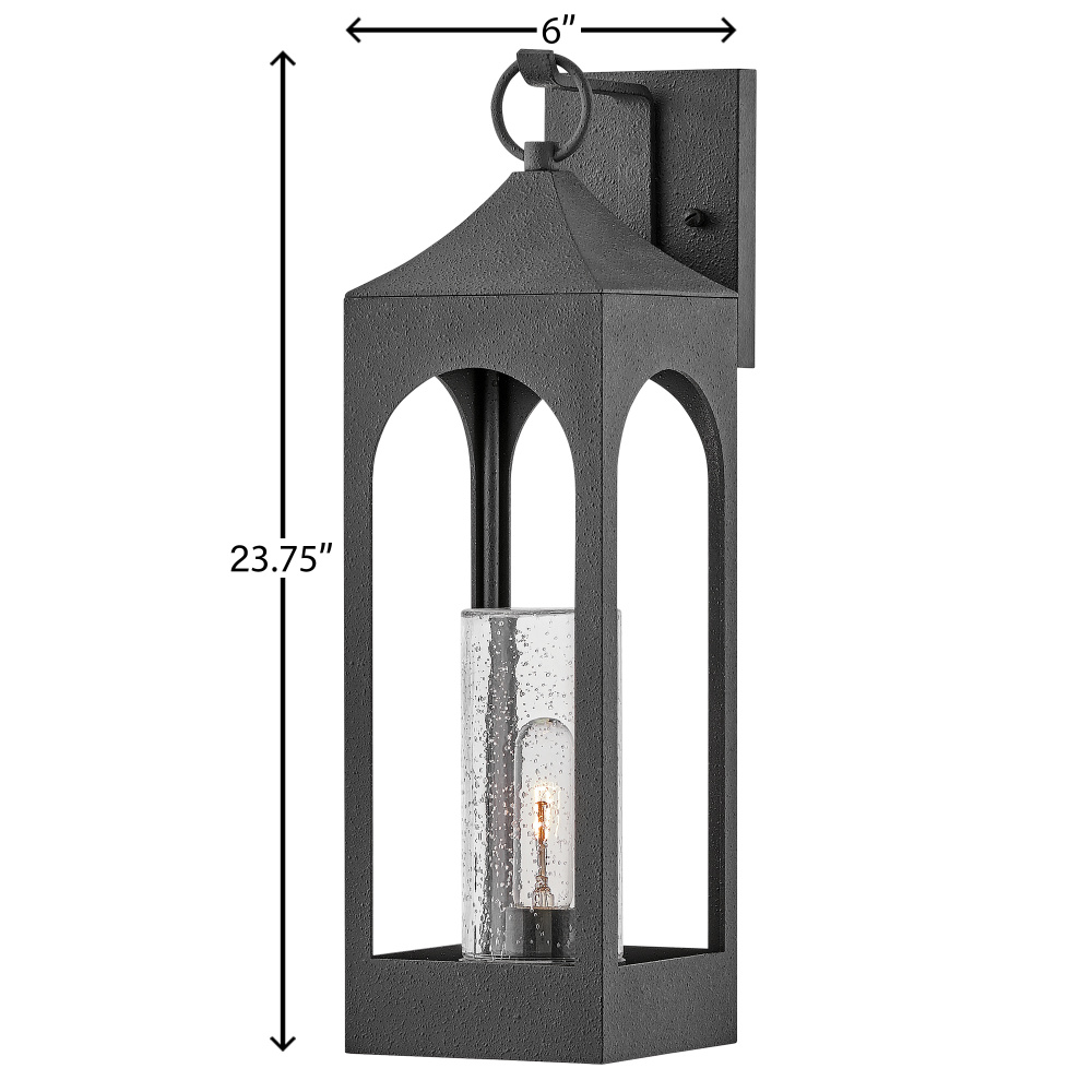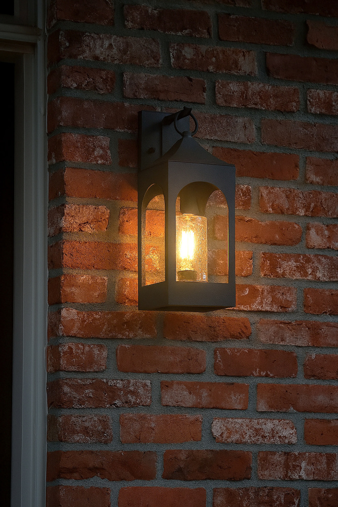 Amina is tradition with a flair. This lantern-inspired design features dramatic, arched windows revealing a seedy glass that creates a faux candle effect. Constructed of durable aluminum in a Distressed Zinc finish, Amina is complete with an oversized loop reinforcing its timeless appeal.