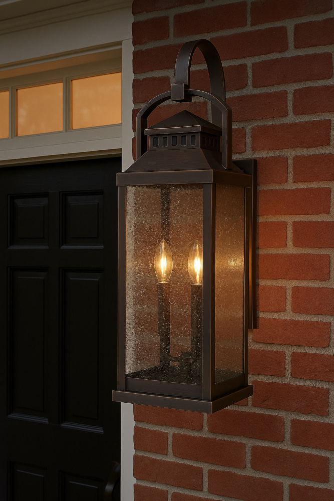 Revere is a traditional coach lantern in solid brass with clear seedy glass panels. The glass, faux candle sleeves and classic candelabra bulbing complete the authentic appearance.